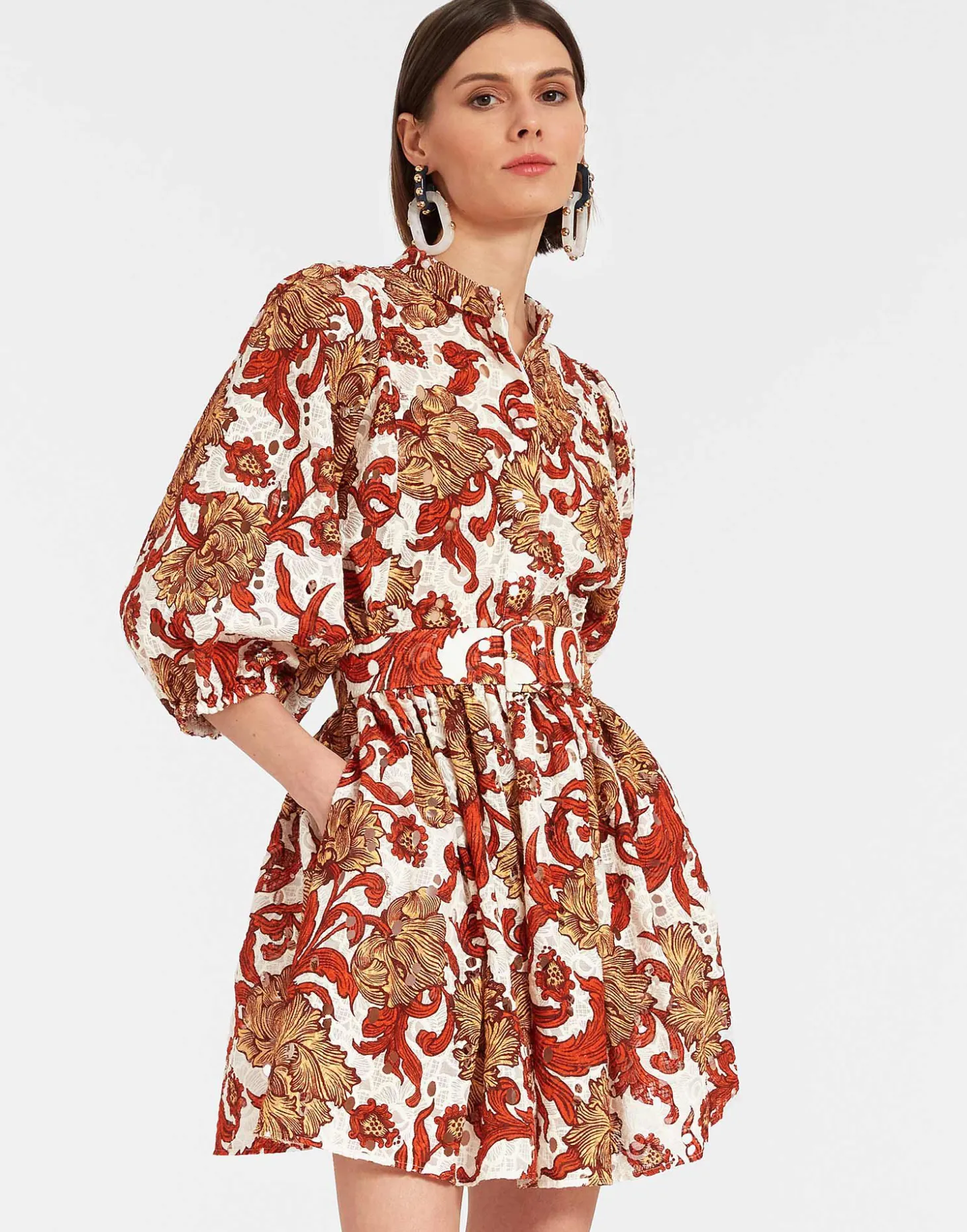 We took our signature silhouette, the best-selling Portofino, and made her mini for those hot summer nights at Splendido Mare. Same voluminous sleeves, same chic, Korean collar, same laid-back allure, just with a little more leg to show off that tan. The nipped in waist now comes with a removable ribbon belt so you can emphasise your forma or float free as you wish. Cut in our crisp printed lace, you’ll be wearing this beauty from espresso to aperitivo all summer long.
