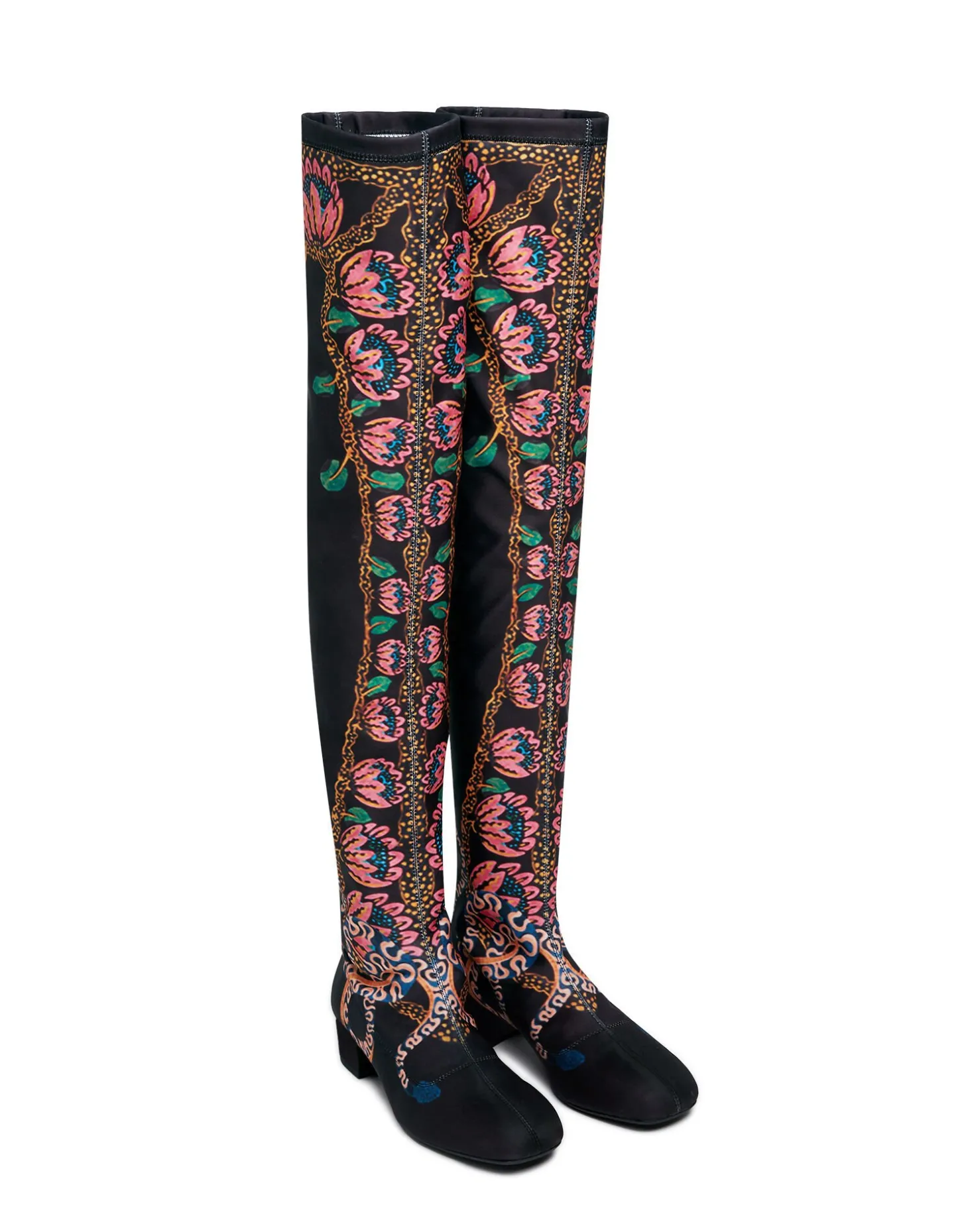 High and mighty, these long leggy wonders are a slinky spin on a classic seventies shoe, made in our most vibration raising prints that just crave attention. Crafted from stretch jersey in our beautiful bohemian Eve print from our Estelle & Chiara “Eden” capsule, they are both easy to pull on but hug the leg snuggly, finishing just above the knee with a chunky printed heel. Styling-wise, think of them as your tights and boots in one swift design, which means you can wear them underneath basically everything you own (but we love them with our matching Chiara dress for maximalist impact)