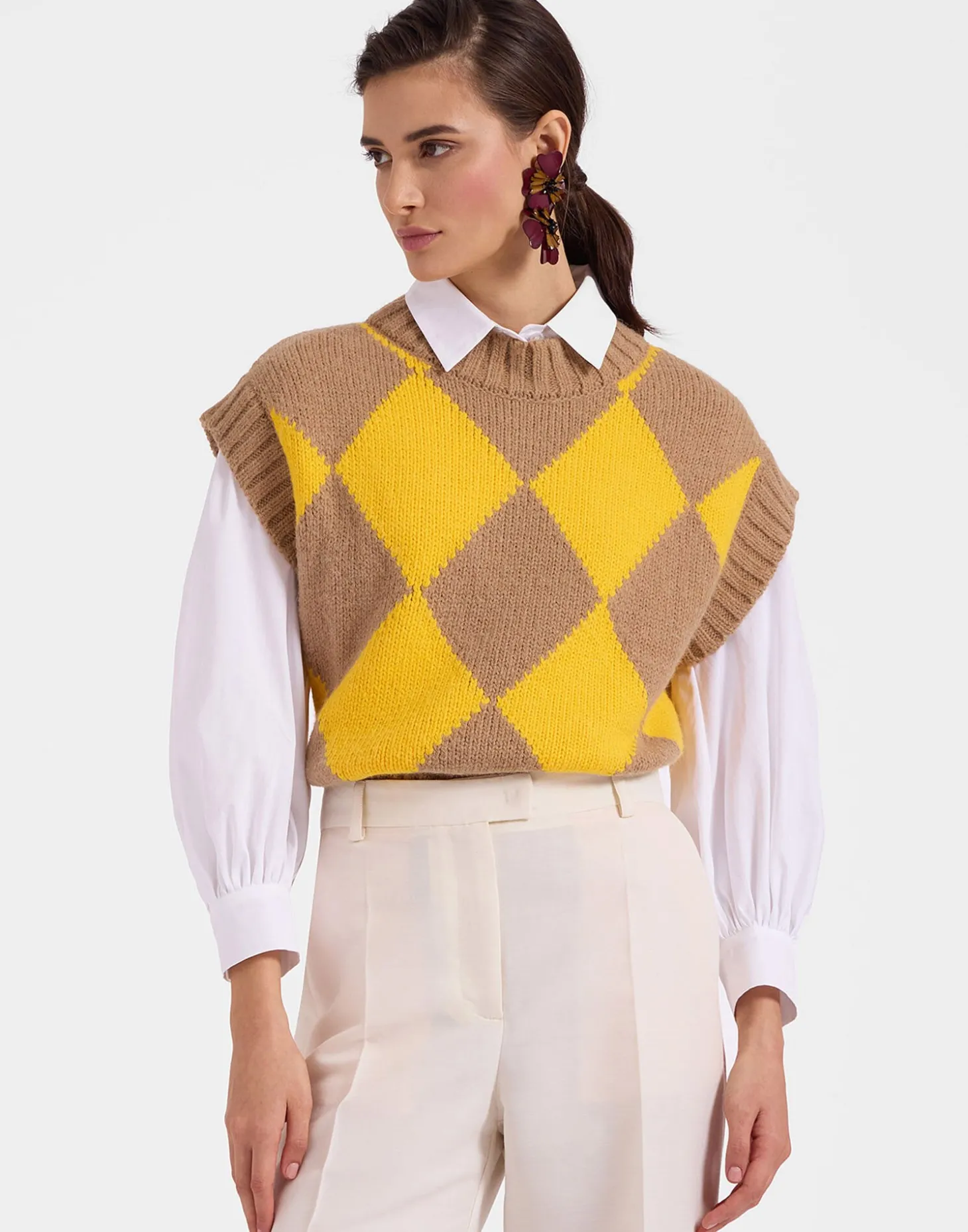 What statement sweater feels better than one crafted from soft bouclè wool? Our Argyle Gilet is made in Italy from a texture-fest alpaca wool blend and is designed to bring high vibes to winter wardrobes in these vibrant happy hues. With a mock neck and slits on the hips, it’s a stylist’s dream with its mannish oversized fit that brings plenty of swag to pretty print dresses or black turtlenecks alike.