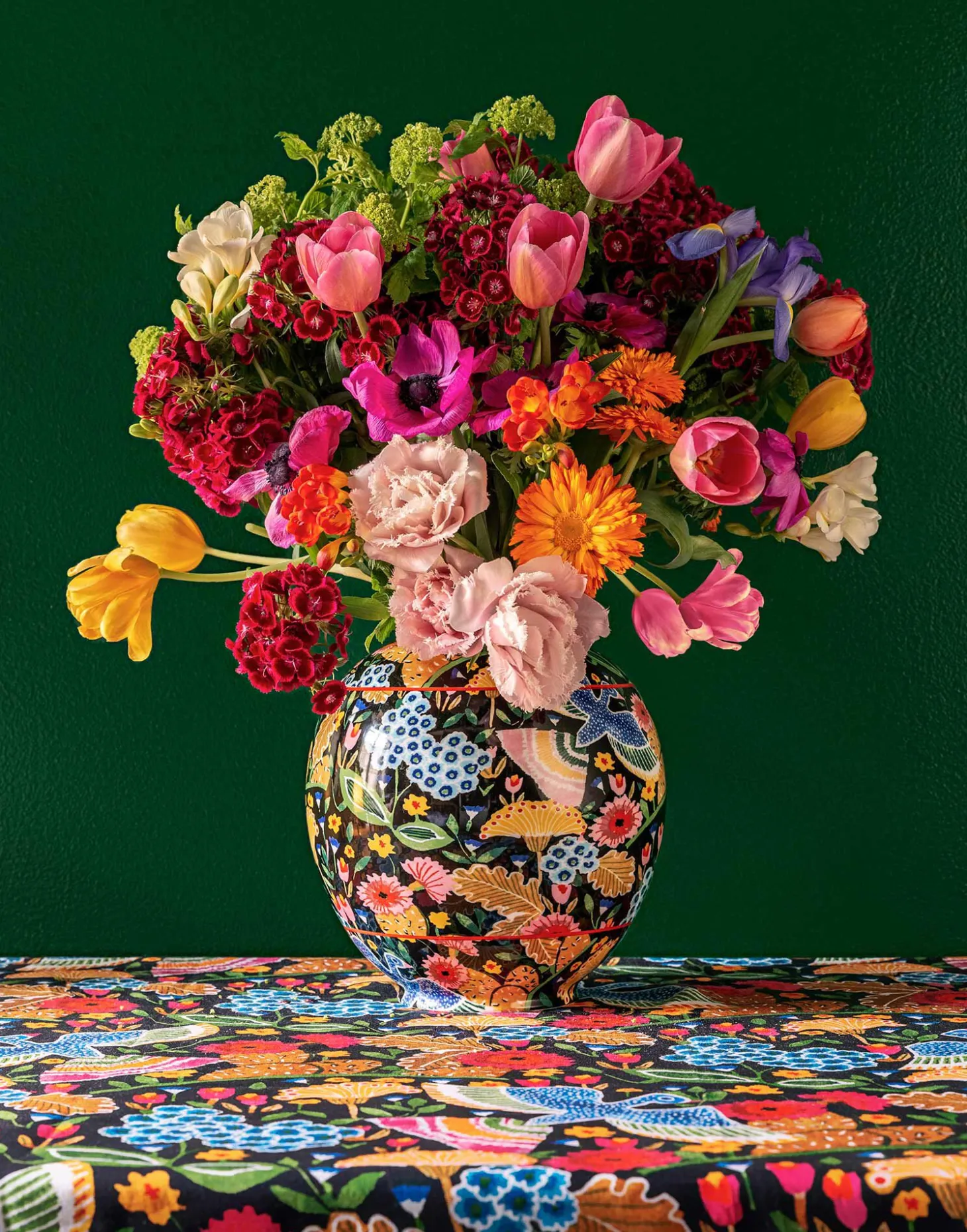Historic Verona-based porcelain maker Ancap were the masters behind this exquisitely printed porcelain vase, which features 18K gold trim, contrast decorative lining and supersaturated colors. The vintage pattern was cut into strips and placed in three different segments so that it could completely cover the round porcelain base and still look totally fabulous. The contrast-colored belly band and gold trim were hand-painted by the most kick ass artisan hands. Contrasting motifs were also designed on the vase’s neck band.
