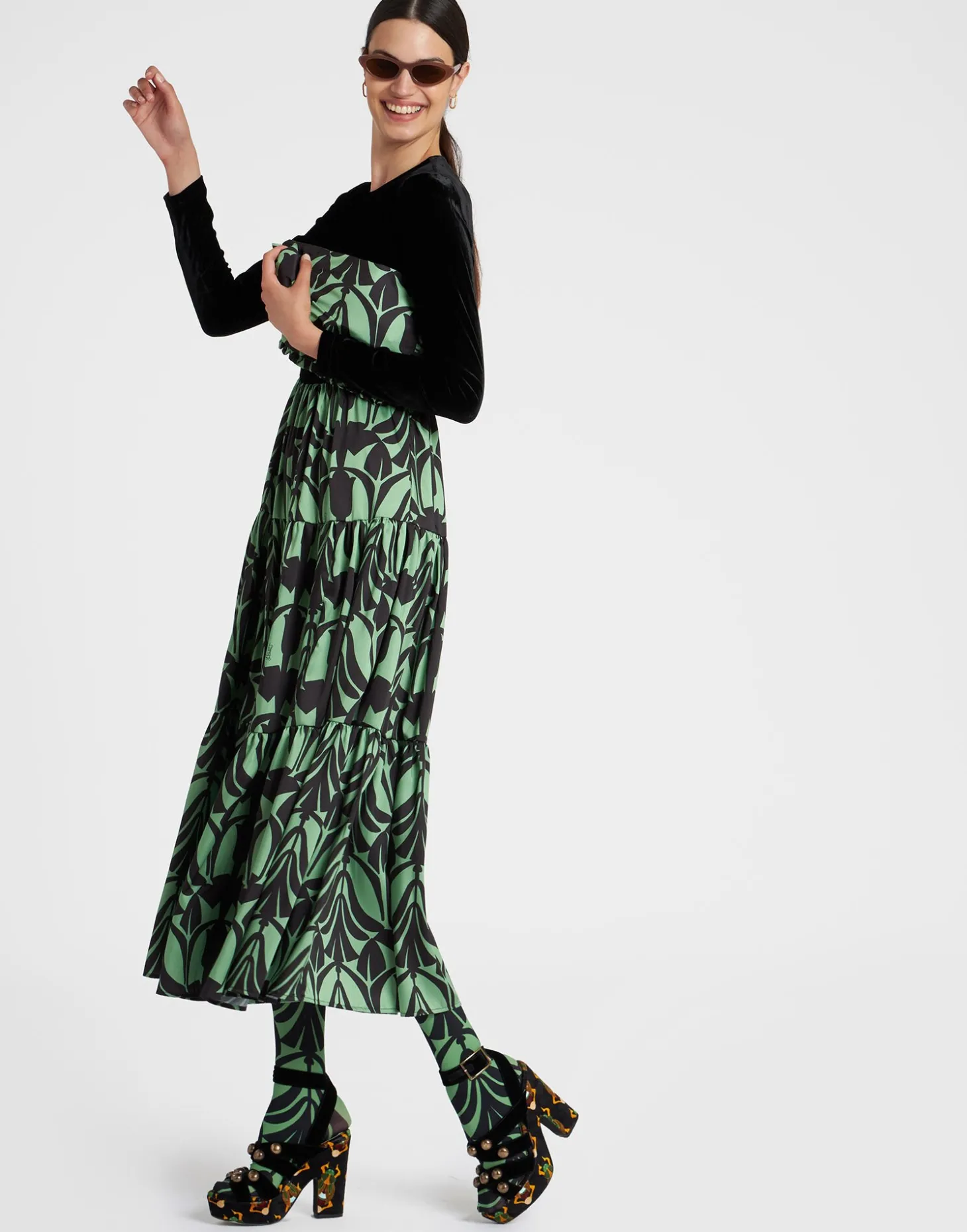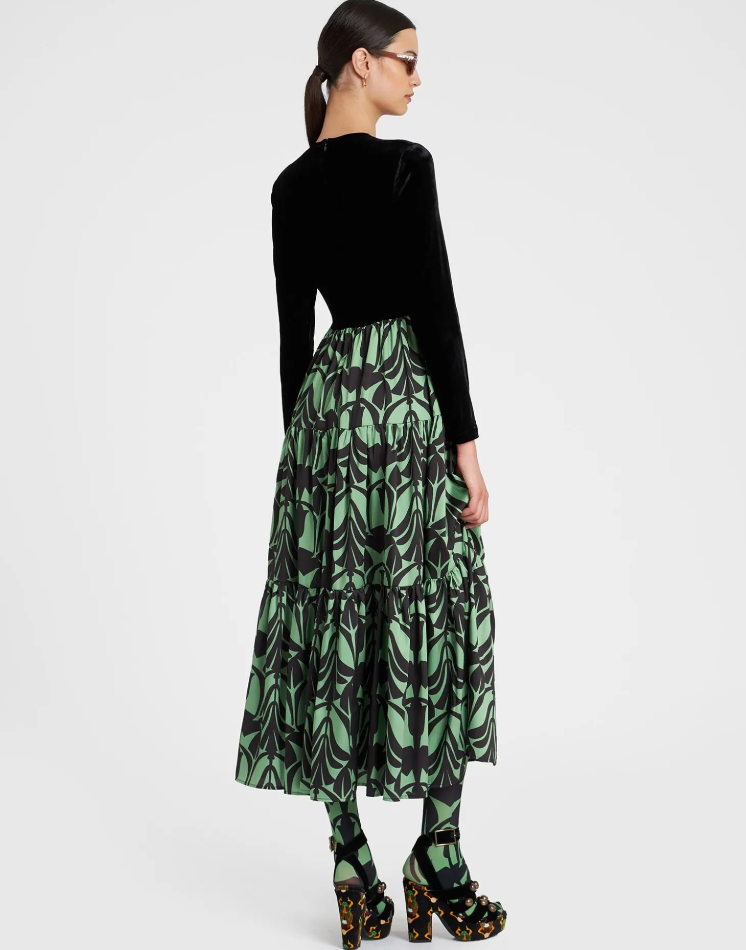 Silky on the bottom, form-fitting on the top, the Big Dress is born from our best-selling Big Skirt and has all the same flouncy va-va-voom. With its four-tiered, ankle-sweeping skirt, this is the kind of number you reach for when you want to really make an entrance – think twilight cocktails before moving on to the Teatro Scala. Done all over in our evocative, Egypt-inspired Papyrus print, the top is crafted in velvet for an extra sumptuous vibe as you twirl late autumn evenings away.