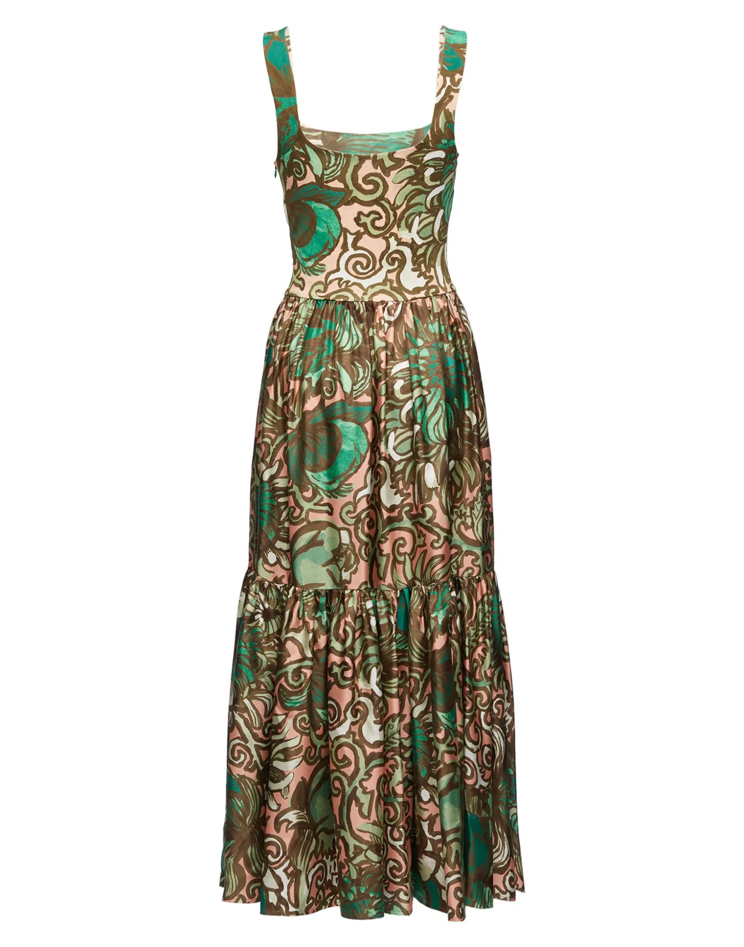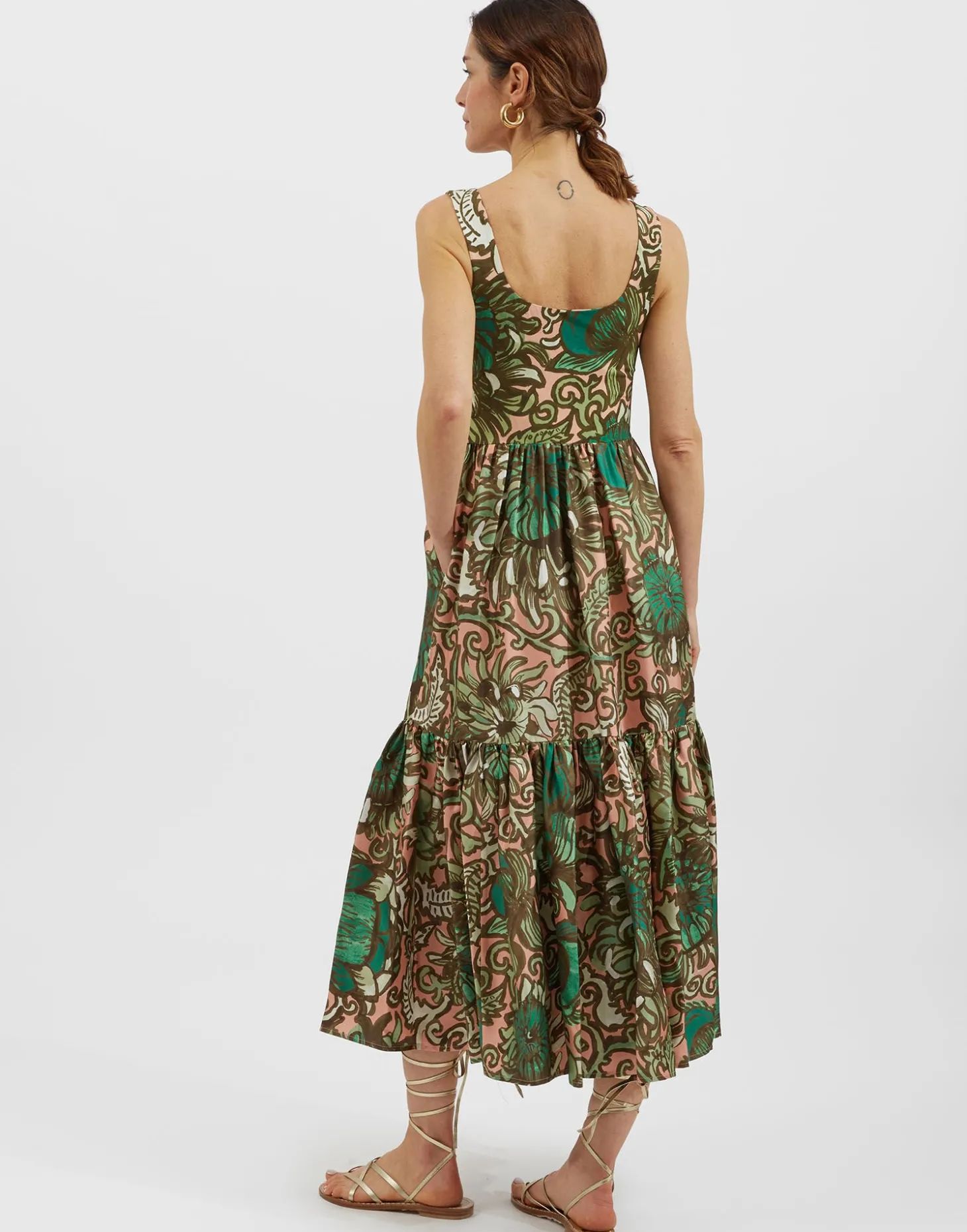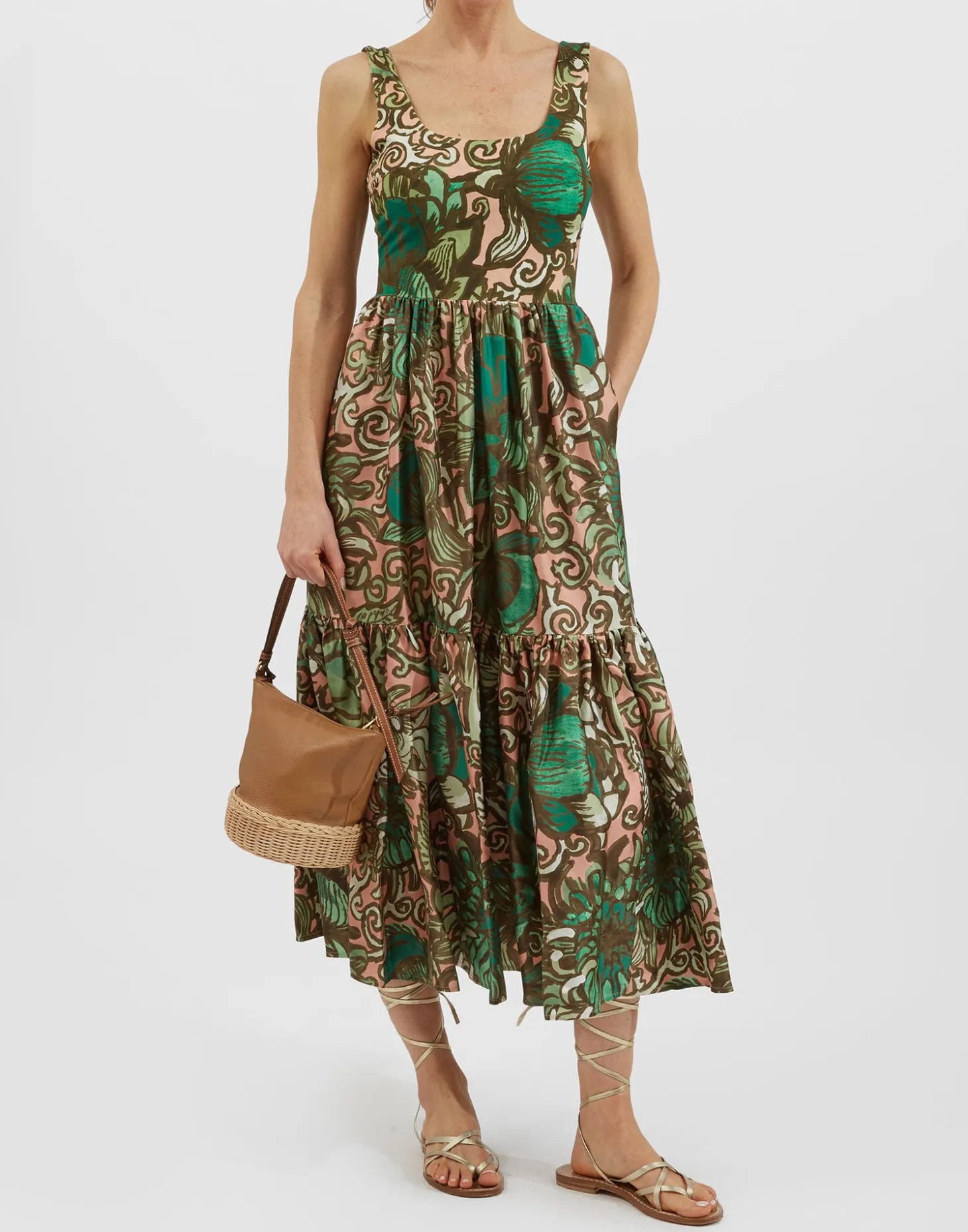 Jersey on the top and silk on the bottom, she’s got flattering, figure-hugging stretch where you need through the bodice and bouncy, soft folds through the two-tiered skirt. The strap is wide enough to accommodate a bra so you can make the most of that exquisite Sophia Loren-esque square neckline. Pair with sandals for a day around the Amalfi before throwing on some heels and jewels for that coastal cocktail hour.