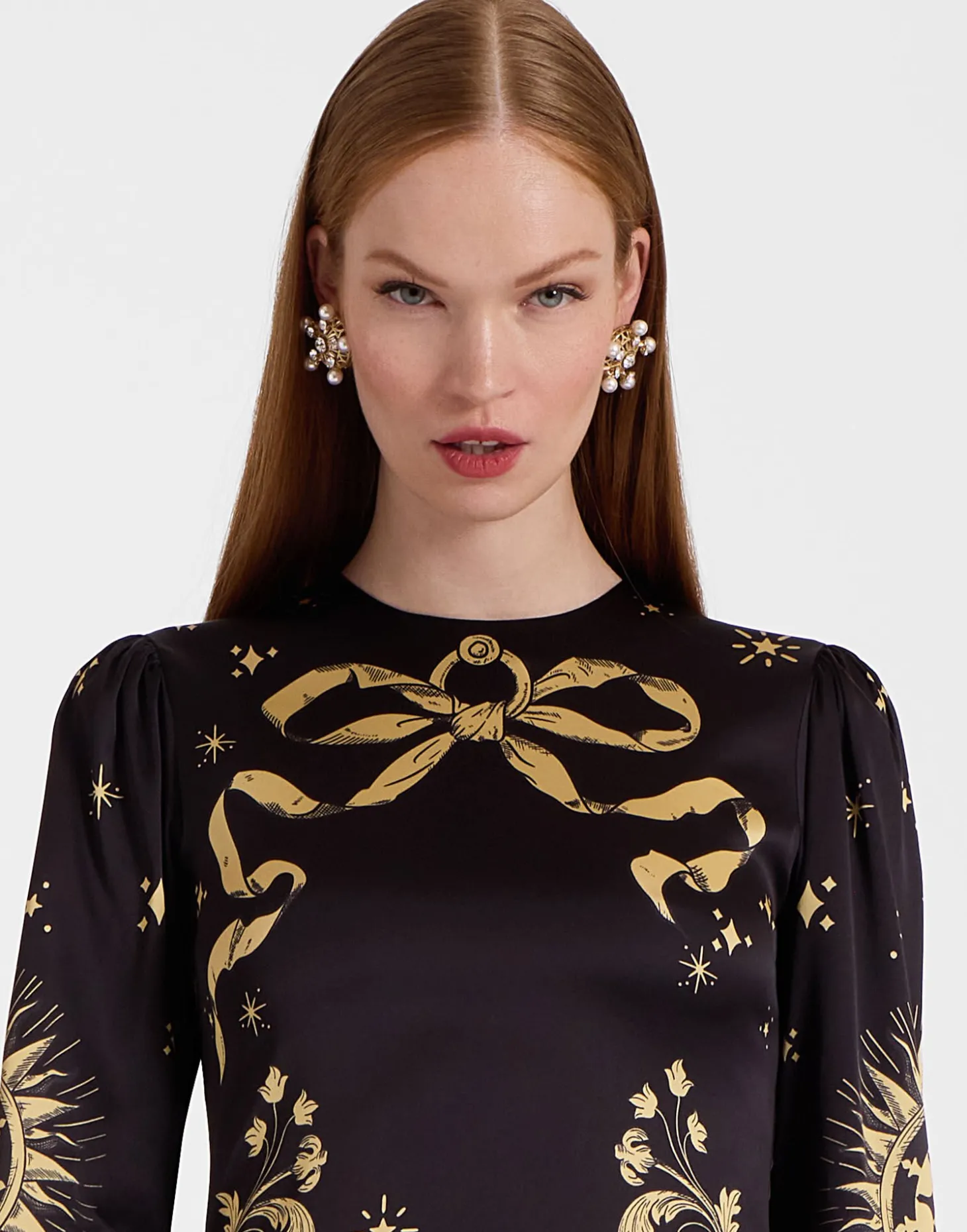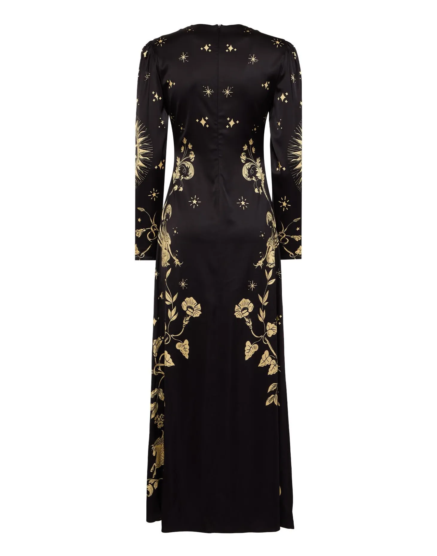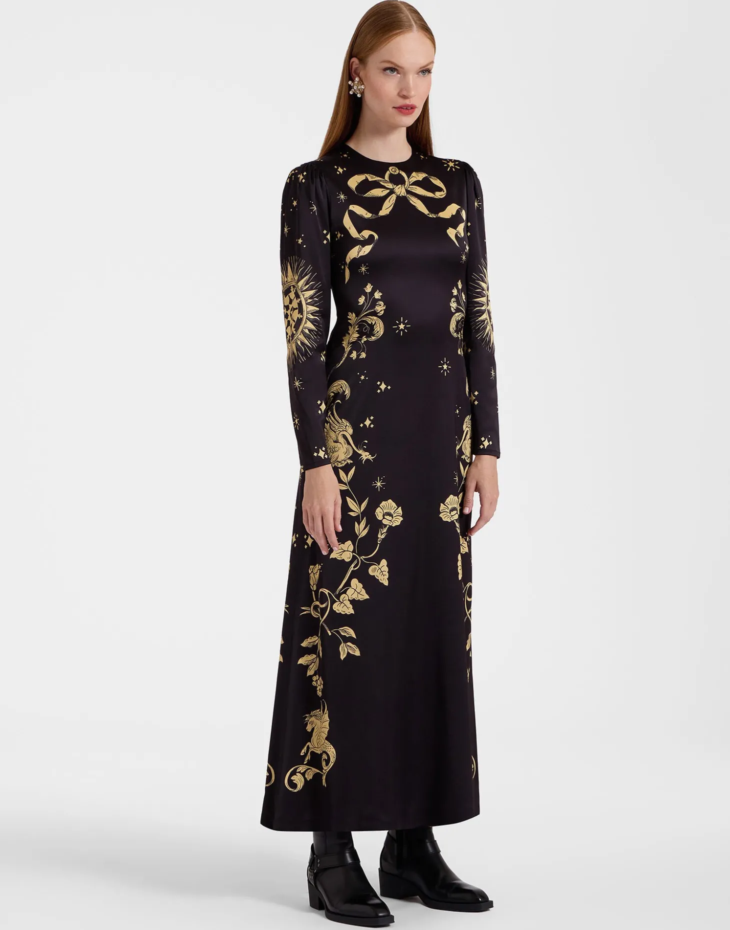 It’s the Long Sleeve Swing Dress you know and love, now in a more sensual, figure-hugging fit. With a curve-celebrating body that flares out at the hips into an ankle-grazing skirt, we crafted this beauty in a stretch Italian satin and hand-placed an exquisite Renaissance-inspired print across her for extra opulence.