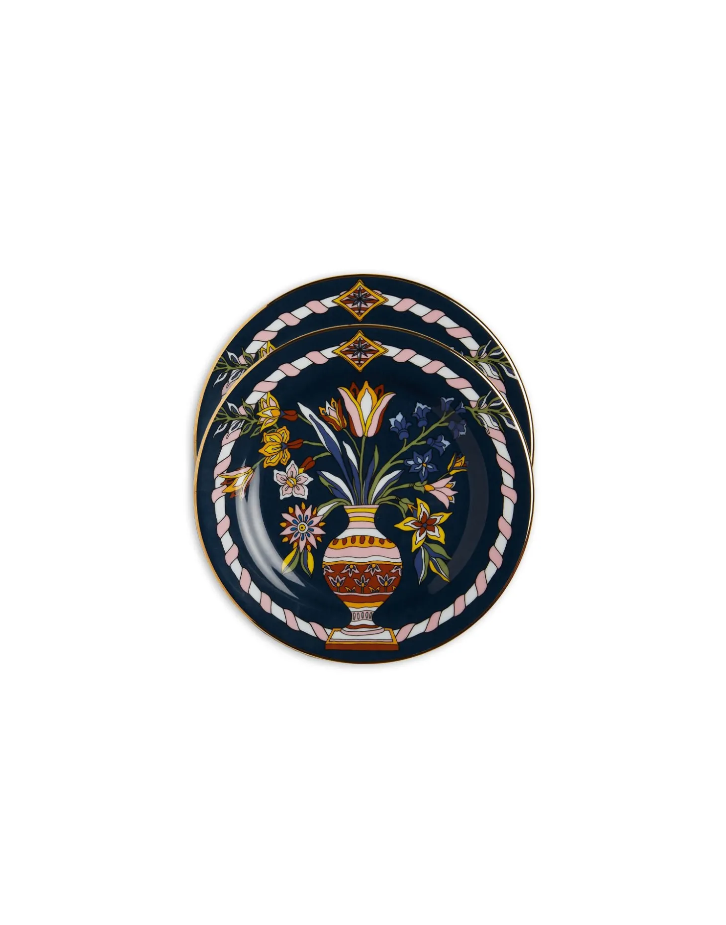 Made in collaboration with our historic Italian porcelain partners, our Dessert Plates are crafted from fine porcelain with hand painted 18K gold trims. This set of two features our elegant Pietre Dure print, named after an ancient mosaic inlay technique, ready to be layered with our dinner and soup plates to happy up your table. Great for a gorgeous wedding, birthday or hostess gift, these plates do double duty, so snag a few for your salad course or dot around your home as a handy spot for keys or crystals as well.