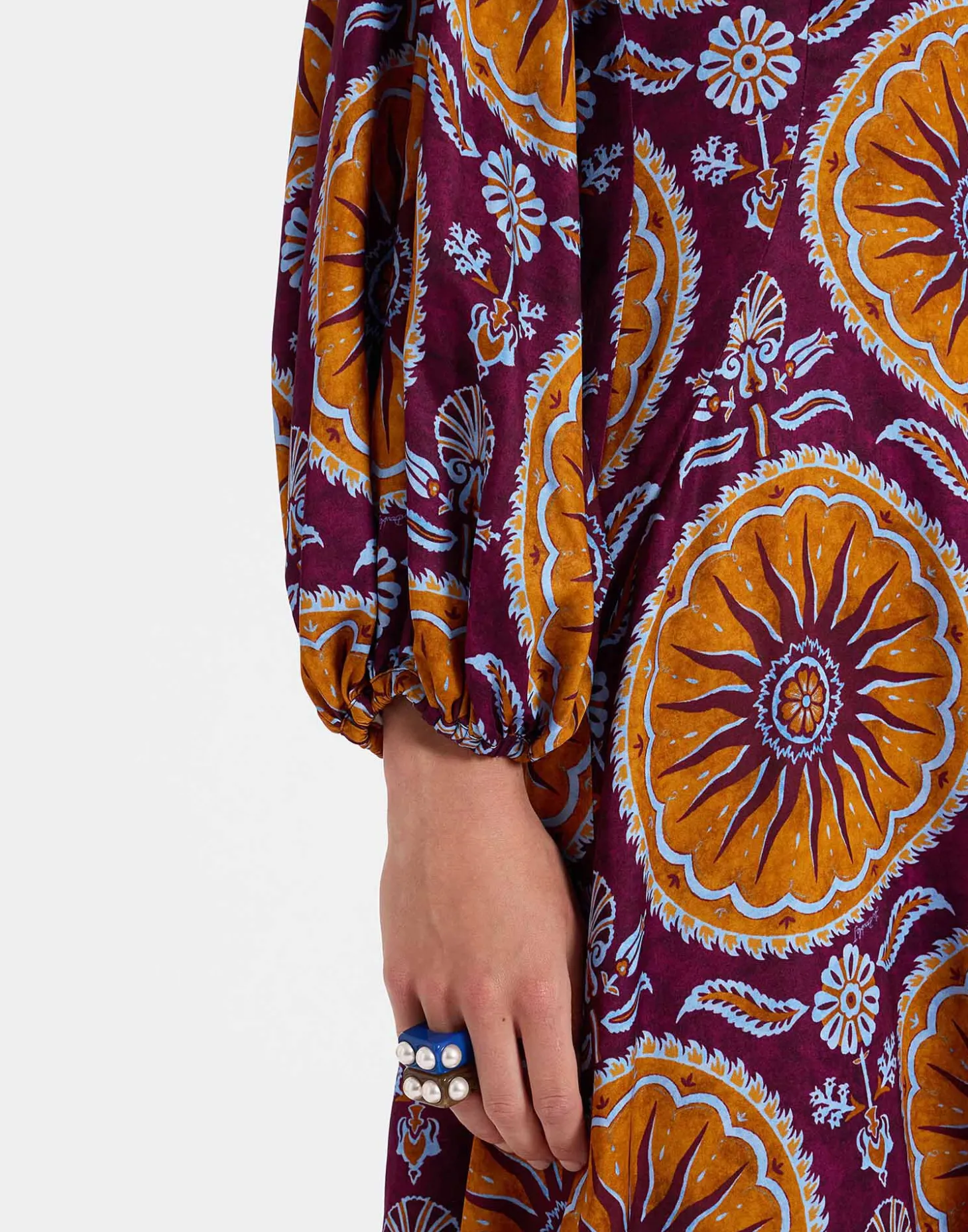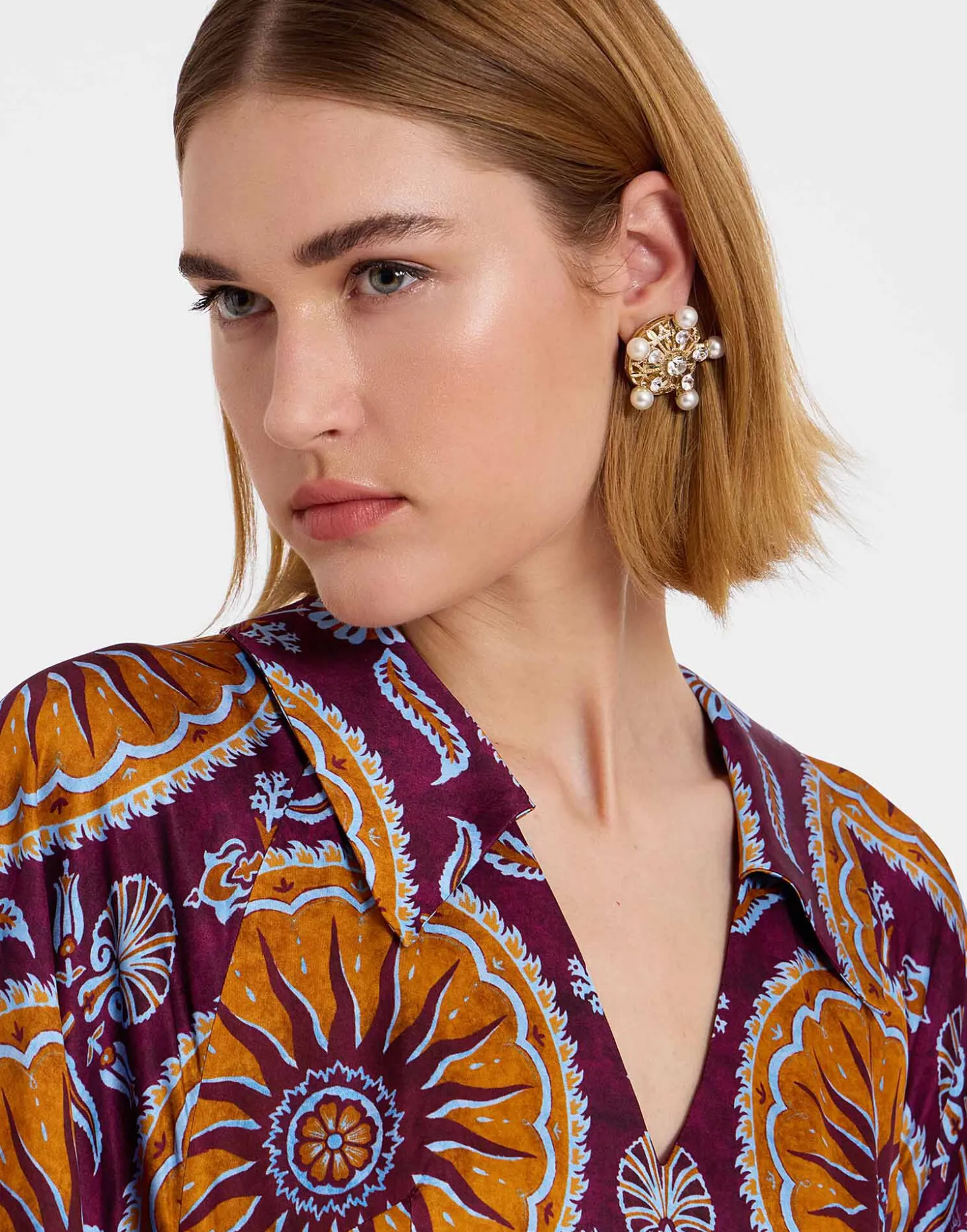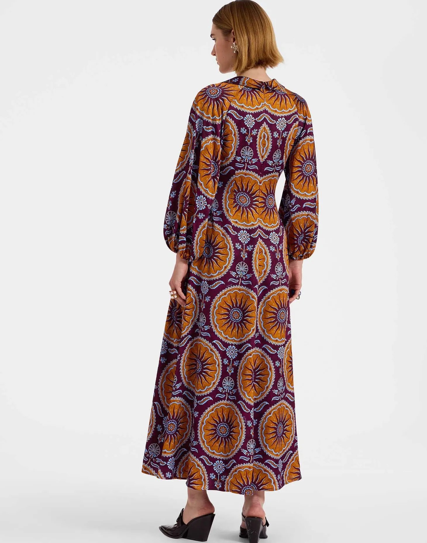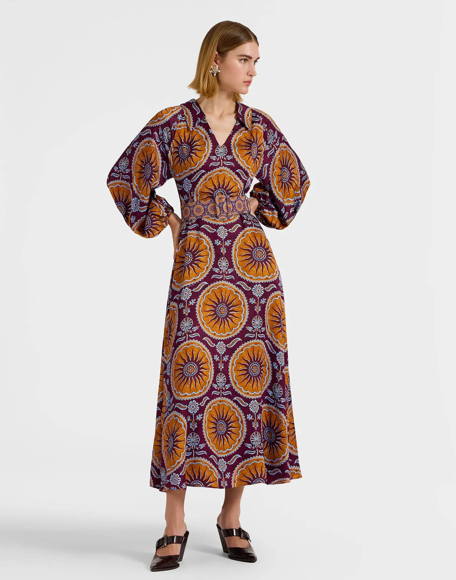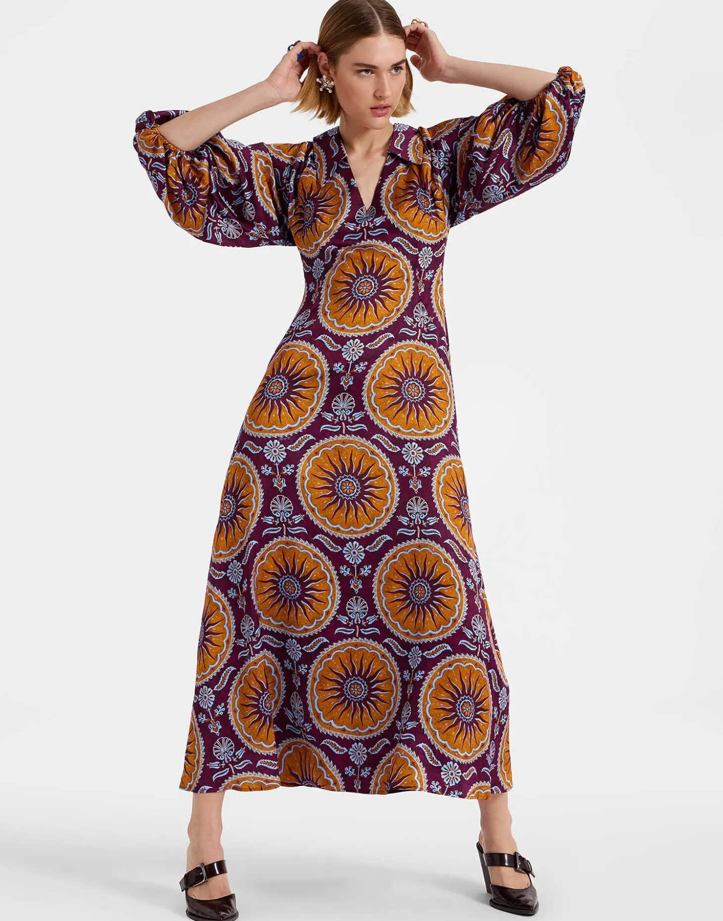 Girl, if this dress doesn’t scream Glastonbury goddess we don’t know what does. With a delicious deep v neck and mock collar, this floor-sweeping gown goes from brunch with your besties to the red carpet premiere with your partner. That voluminous skirt, those diaphanous sleeves, that sumptuous Italian satin….we love her with jewels in the evening and dressed down under a knit gilet for day.