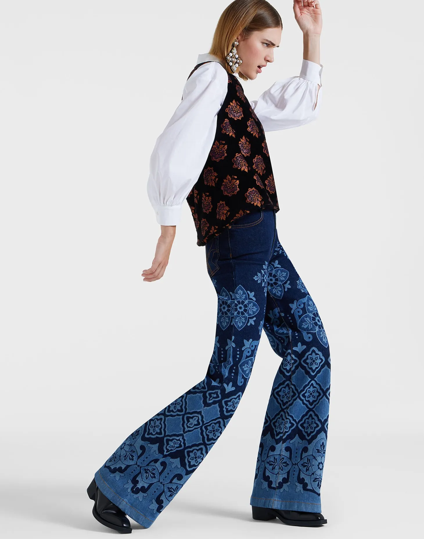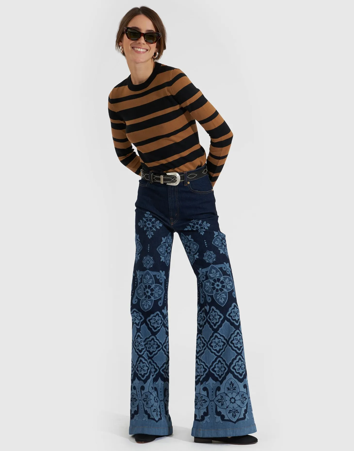 La DoubleJ does denim! Designed for those looking to elevate this everyday essential, these are not your average flares. With a super high waist that hugs your curves in all the right places, these are a modern take on a retro classic, arriving in our exquisite hand-placed, laser-printed Corte print which keep this dark denim from feeling anything but basic. Falling straight to the knee before opening up into a wide, romantic bell-bottom, these beauties have a little stretch built in, so you can channel your inner Studio64 without diminishing their booty-boosting shape. We’re partial to pairing it with our Sisterhood Bomber, but think these are print perfect with our Boy Shirt or any classic tee already in your closet.To help you seize the day the Italian way, you’ll receive a free, special Carpe Denim Weekly Joy Journal so that you can plot out your daily pick-me-ups in high-vibe style. For more tips on what to wear with your fabulous new pair of jeans, check out our guide on How to Style Your Denim here.