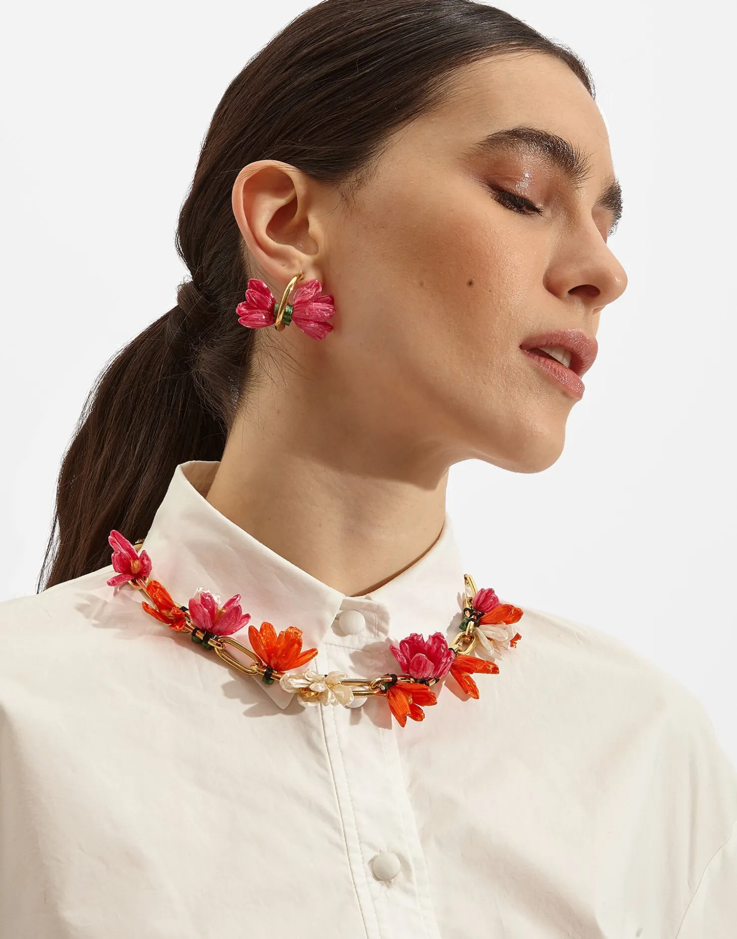 Here she is – Spring on a string. We took a daisy chain and gave it a MAJOR maximalist upgrade. With exquisite red, orange and white raffia blossoms bursting along their gleaming gold chain, it’ll be as if your décolleté is hosting a fireworks display. Pair them with Flora Earrings for ultimate flower power prowess.