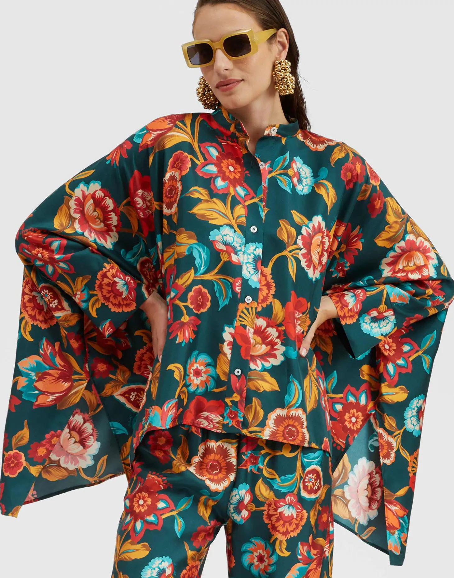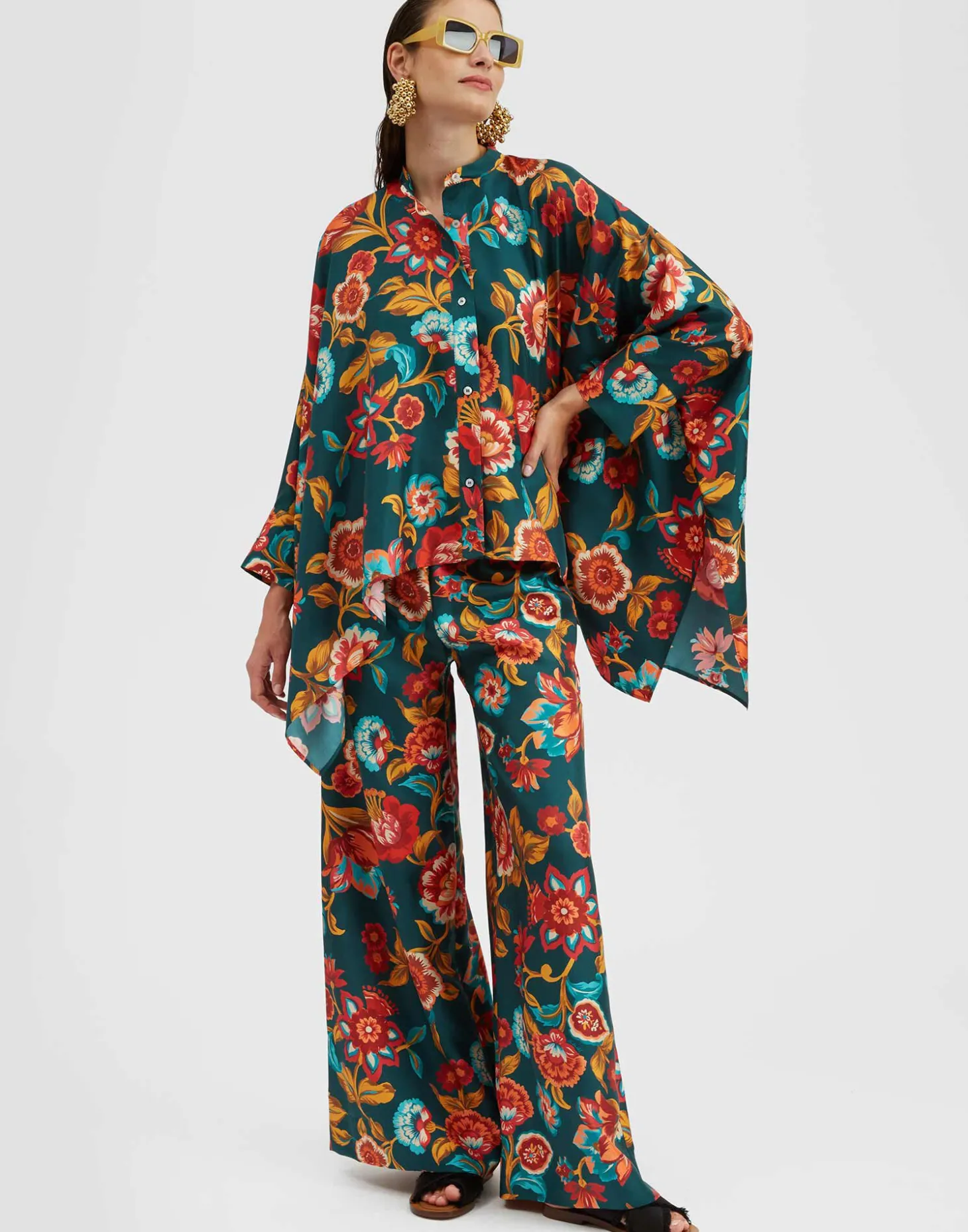 A J.J. staple year-round, our gorgeous silk Foulard Shirt is like a walking fine art piece. Part shirt, part poncho, it’s crafted in fluid Italian-made silk in a chic waterfall style fit that is flattering on all shapes and sizes. A beautiful canvas for our eye-catching prints that looks next level styled with our Palazzo Pants, let it float you around all your special RSVPs this season.