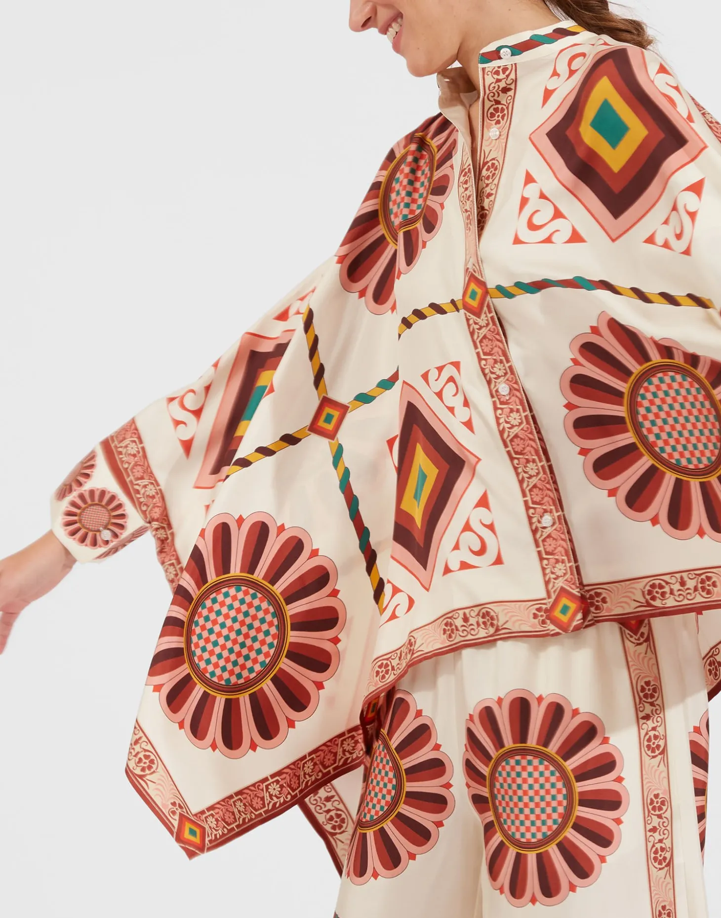 Is it a shirt? Is it a scarf? Actually, this beauty is a little bit of both. We’ve nattily transformed an Italian-made silk square scarf into a shirt design that looks great on all shapes and sizes thanks to its waterfall style fit. The fuss-free silhouette drapes off the arms with a cute Korean collar you can button up or let loose. Turning the elegance dial high is this gorgeous print inspired by Neopolitan tiles and exquisitely placed by hand to fall right every time.