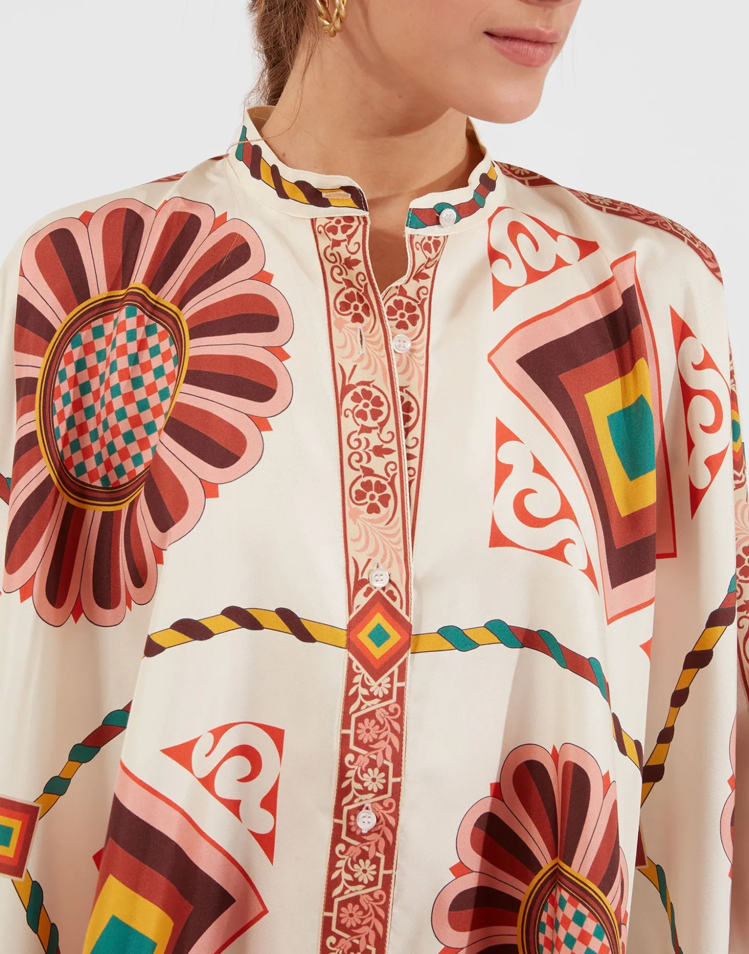 Is it a shirt? Is it a scarf? Actually, this beauty is a little bit of both. We’ve nattily transformed an Italian-made silk square scarf into a shirt design that looks great on all shapes and sizes thanks to its waterfall style fit. The fuss-free silhouette drapes off the arms with a cute Korean collar you can button up or let loose. Turning the elegance dial high is this gorgeous print inspired by Neopolitan tiles and exquisitely placed by hand to fall right every time.