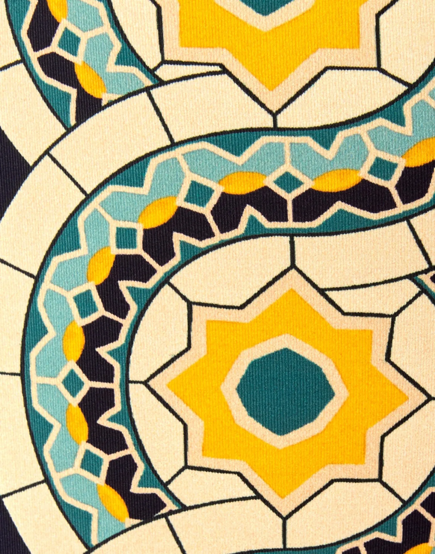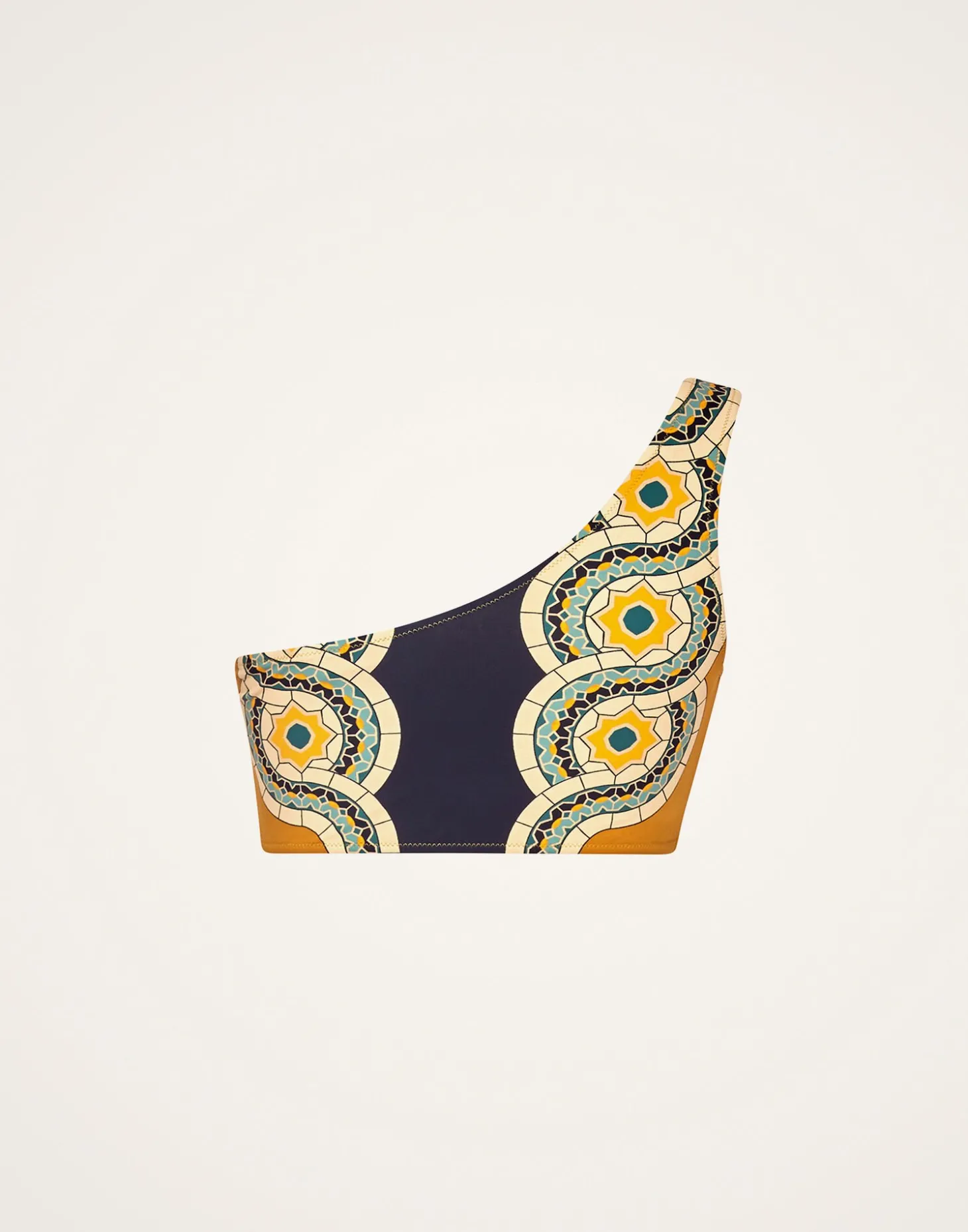 This one-shoulder wonder is our version of the Goddess Suit for you gorgeous girls who like a tummy tan. With a single adjustable strap that lets you tie the bow as tight or loose as you please, it arrives hyper chic in this Deco-inspired hand-placed Mudejar print for all your sophisticated beach club moments. Dive in with the Boy Briefs to match.