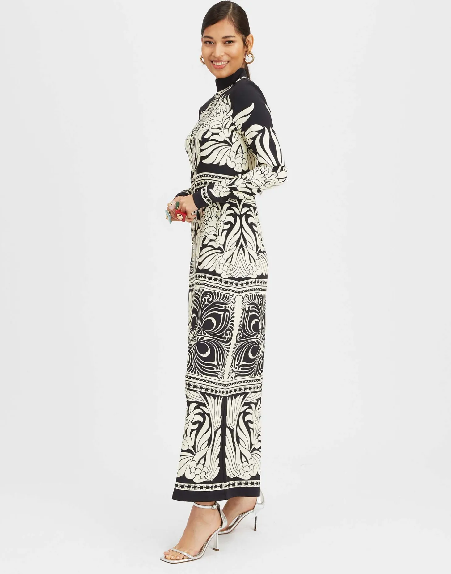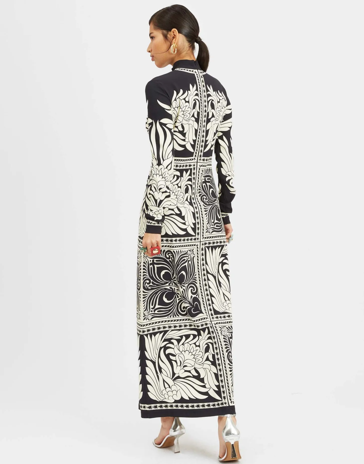 Bodycon, but better, the Halle Dress is a sleek canvas for our exquisitely hand-placed prints, including this elegant Tiles motif hand-placed by our Italian artisans to fall perfectly on your body every time. Cut in a column silhouette with demure long sleeves, it’s beguiling (and versatile!) in black and cut from slinky satin which looks and feels fabulous. A fancy, floor-sweeping delight.