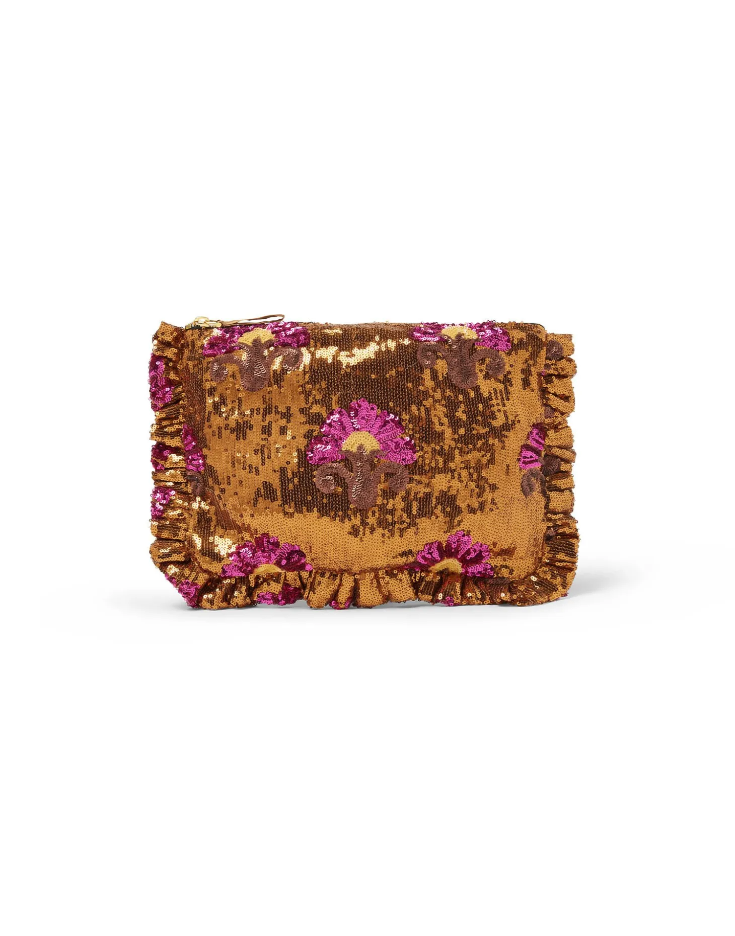 The ultimate Saturday night flourish, our oversized zip pouch arrives in opulent printed paillettes, which will not only elevate the status of your dinner-to-dancing outfit but also easily house a cell phone, mini tablet and cardholder. The side handle makes it super easy to carry around which – great news! – gives you free hands to hold your Bellini at a cocktail party.