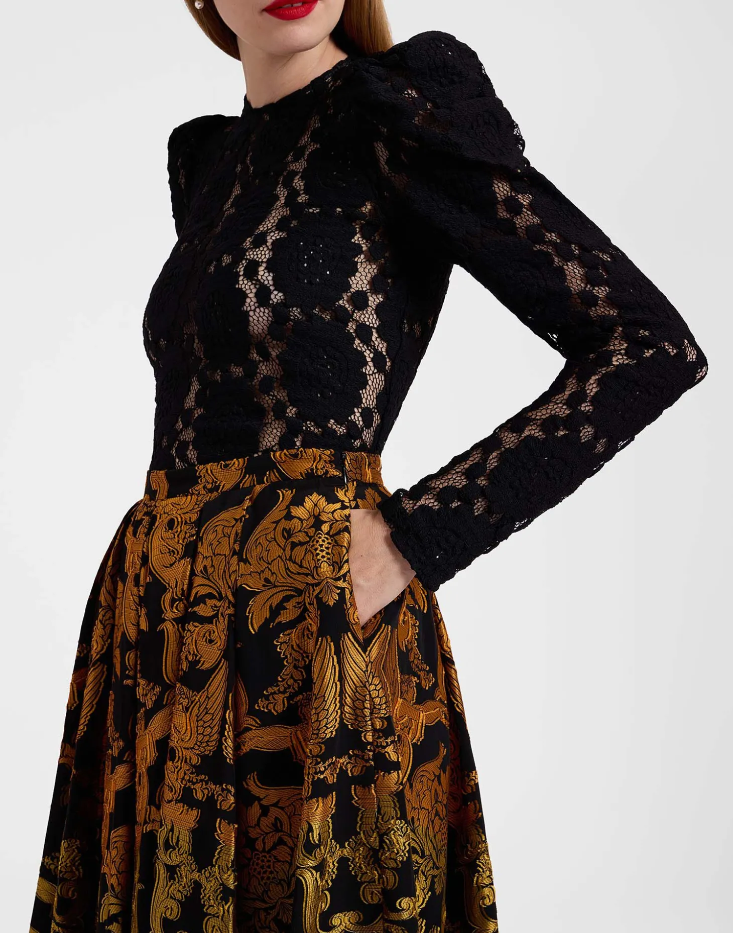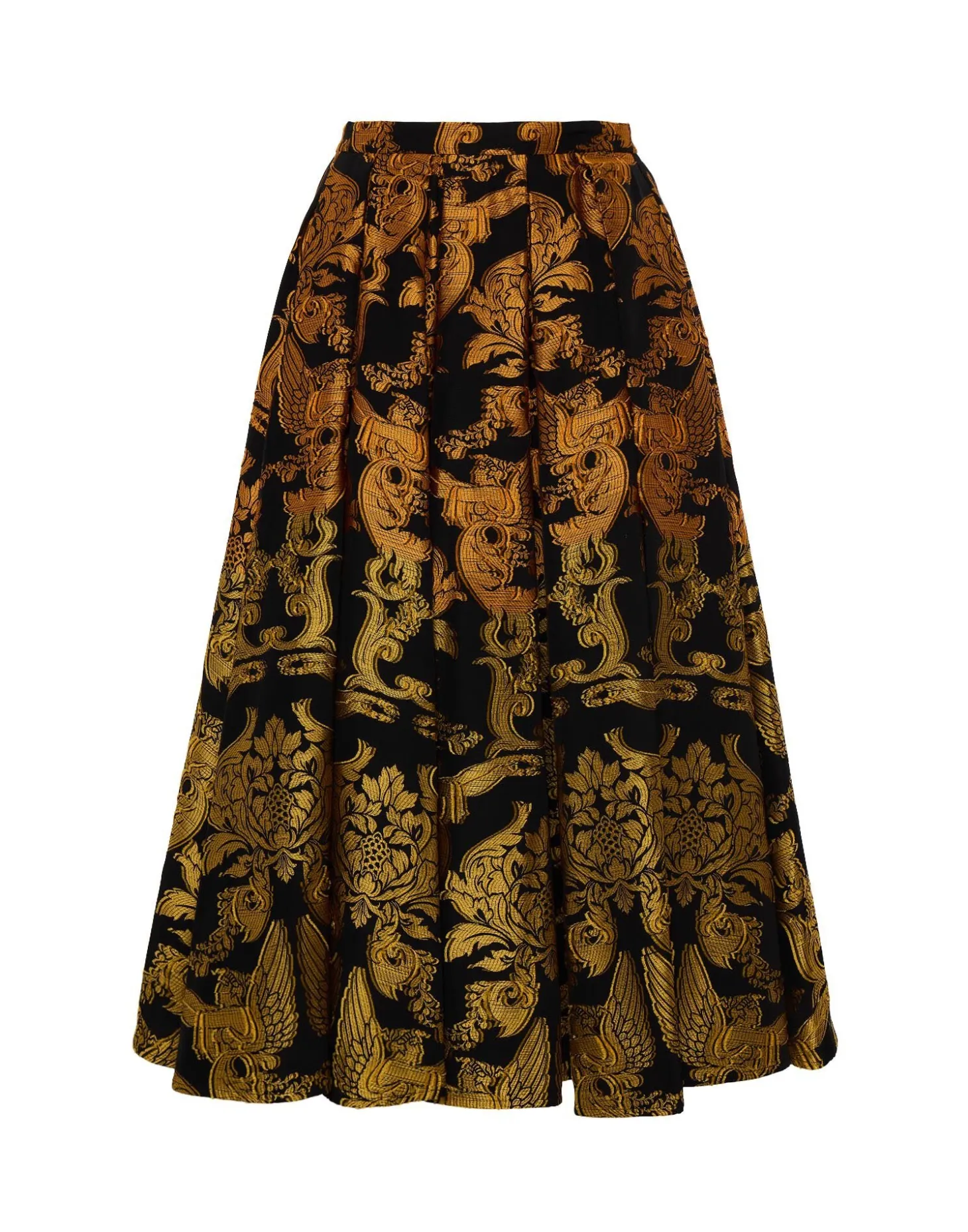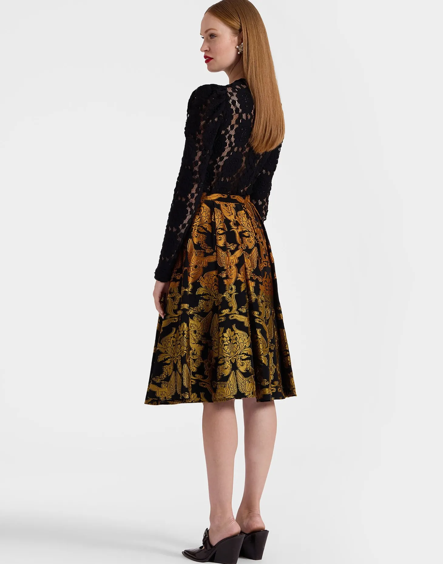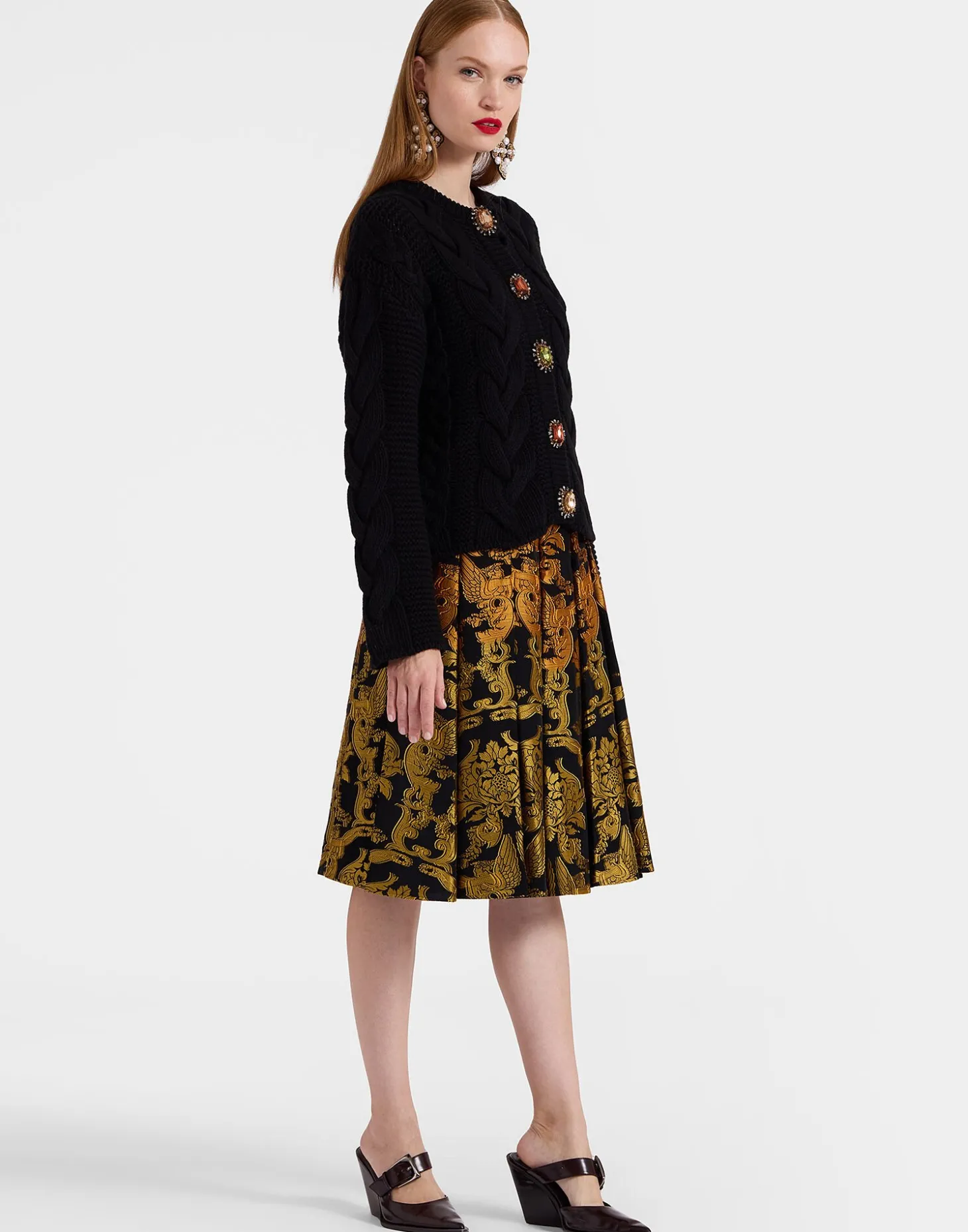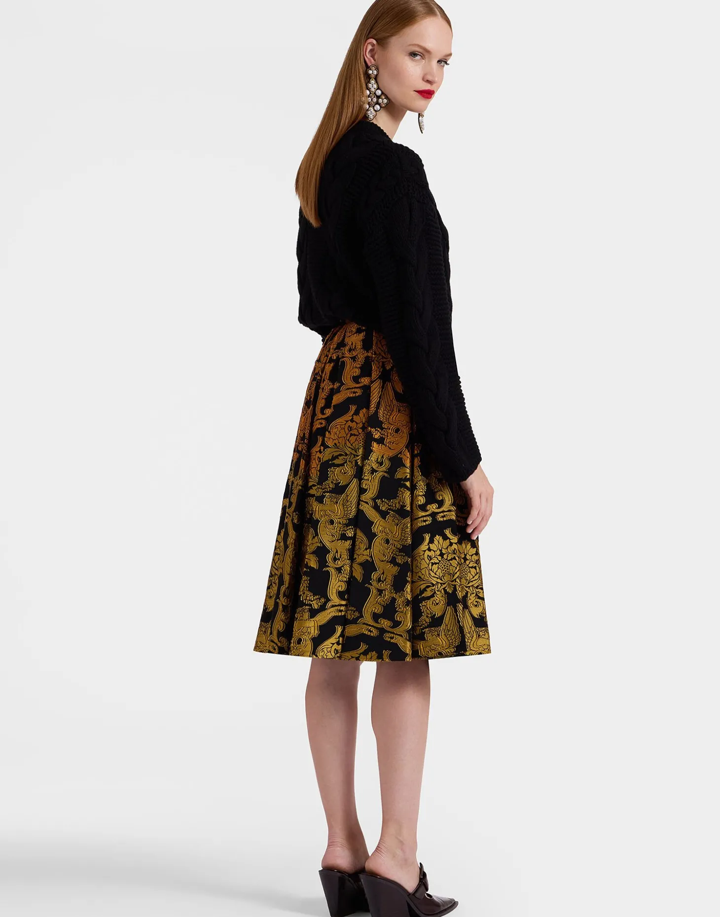 There’s something about a pleated skirt – it’s romantic, it’s sweet, it’s sophisticated, it’s chic. This version’s trapeze shape means gives her magic movement as you wander from the office to cocktail hour and, crafted in our shimmery fil coupé in this Renaissance-inspired Cherubs print, she adds a little dazzle to your everyday dressing. We love her with the Kelly Jacket as a suit but she’s just as sweet under an oversized Boy Sweater or French Toast Cardigan.