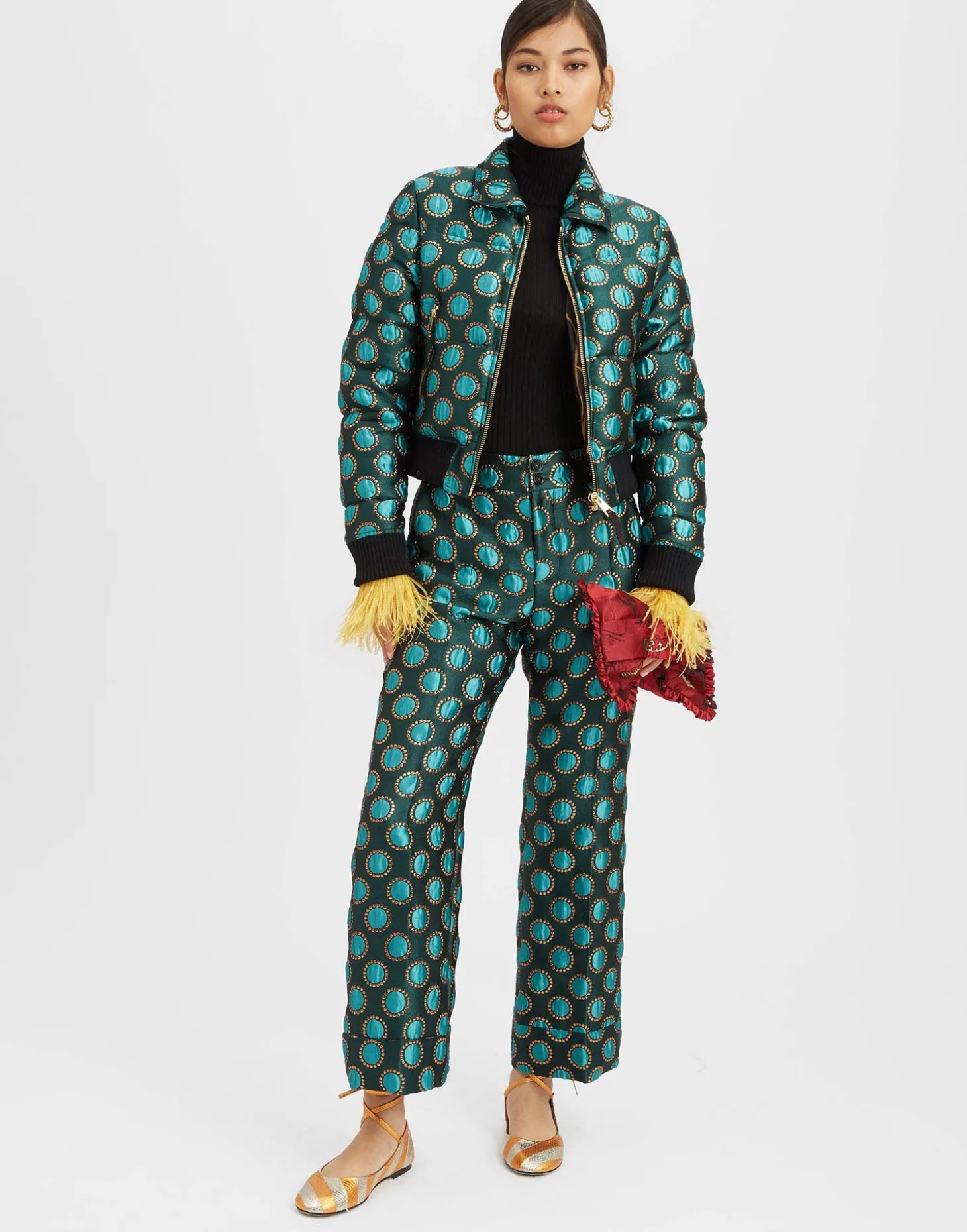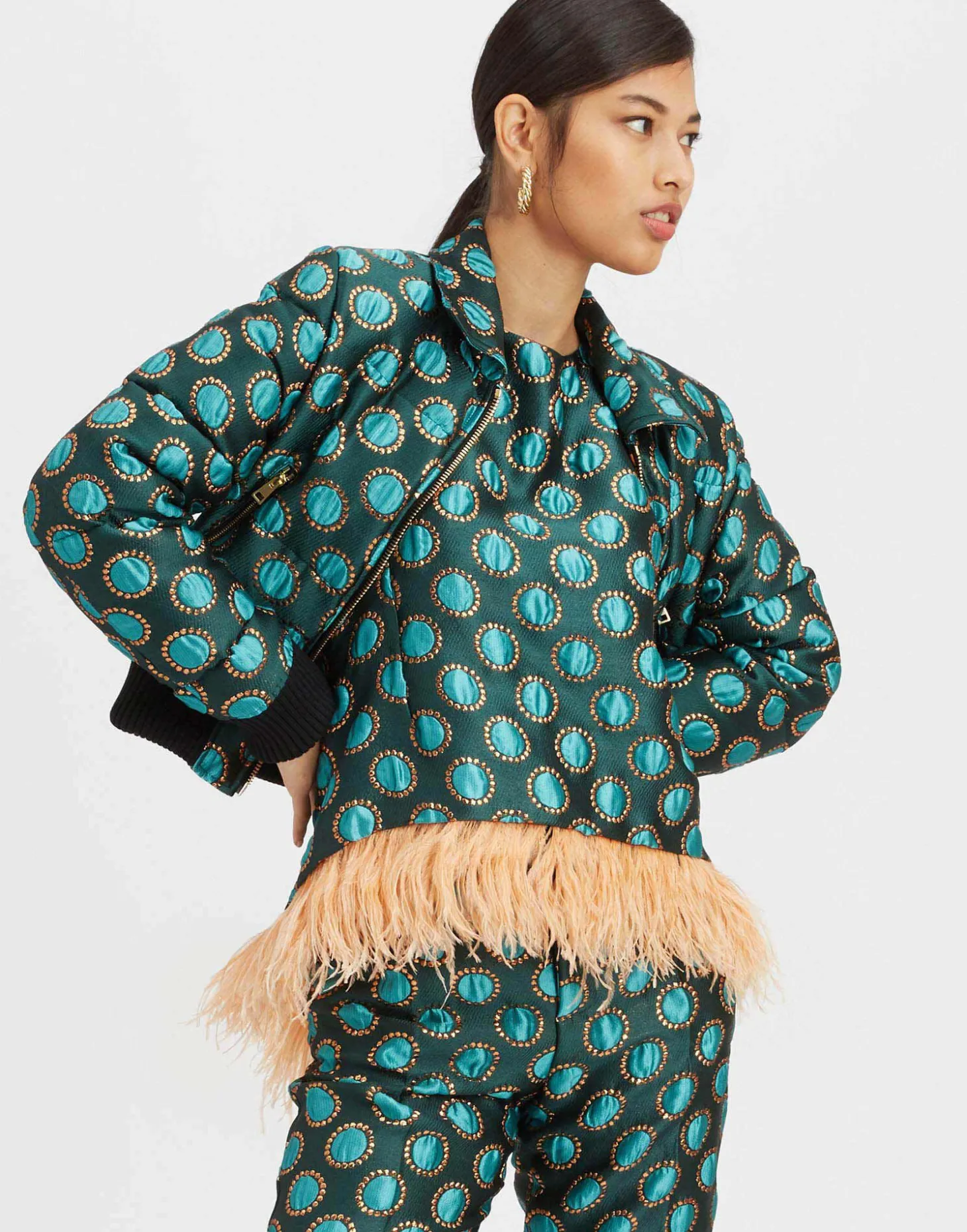 Layer-up in luxury with our La Comasca Mini Bomber: puffy, petite friendly and ready to party this holiday season. Done in plush jacquard in our versatile Winter Sun motif, it has all the hallmarks of a classic bomber silhouette with its ribbed hem hitting just below the waist to give your evening look plenty of shape. Serves up vintage attitude whether you style it with our new Baby cocktail dress and platforms or your fave blue wash jeans.