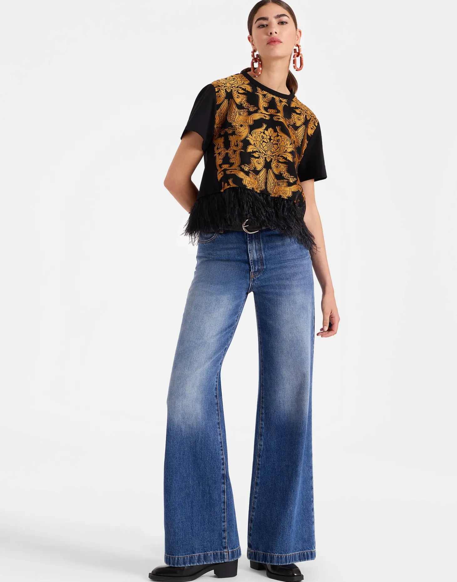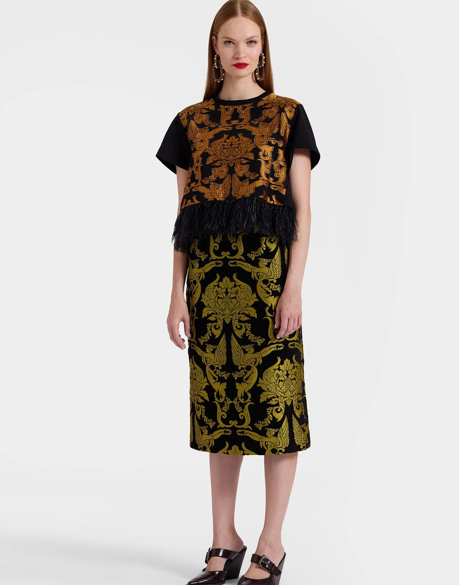 How to add a little drama to the everyday? Allow our La Scala T-shirt to take to the stage. This beauty follows its predecessors with a fabulous contrast ostrich feather trim. We’ve balanced it out with a cool, cropped T-shirt silhouette in our shimmery fil coupé which means it’s as great for a sassy high-low city look as it is for something more special. Structured not weighty, boyish and boxy, it’s super pretty with our A-Long Skirt or go full-on maximalist with the matching Saturday Night Pants.