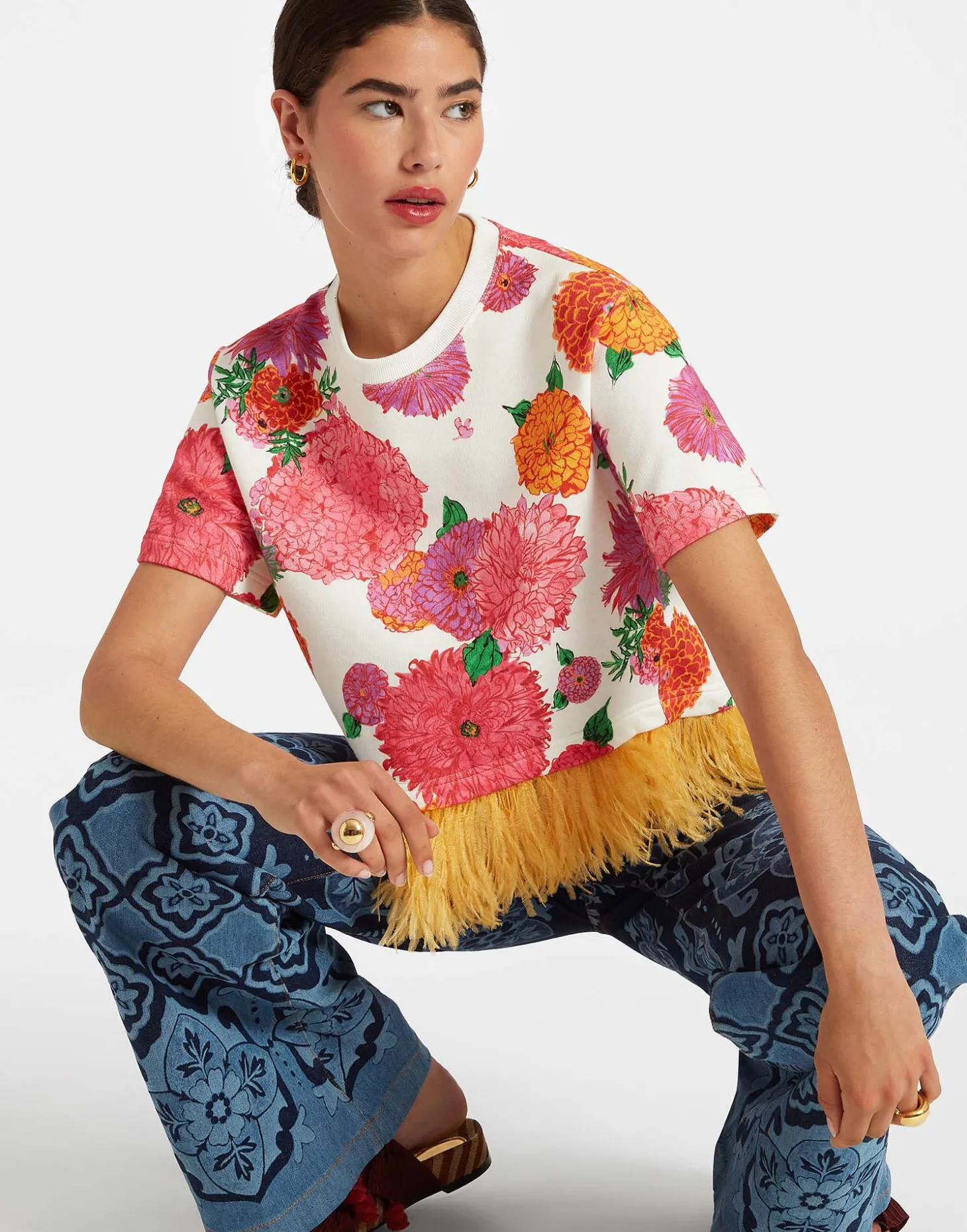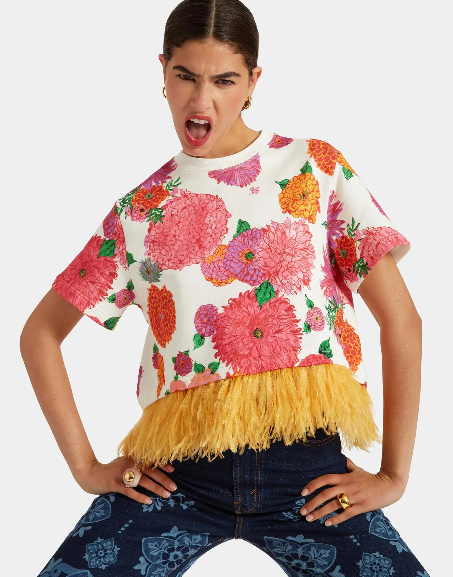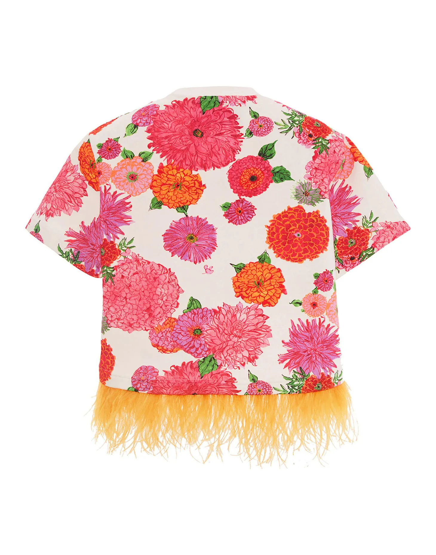 How to add a little drama to the everyday? Allow our La Scala T-shirt to take to the stage. This beauty follows its predecessors with a fabulous contrast ostrich feather trim. We’ve balanced it out with a cool, cropped T-shirt silhouette in our thick cotton jersey which means it’s as great for a sassy high-low city look as it is for something more special. Structured not weighty, boyish and boxy, it’s super pretty with our A-Long Skirt or go full-on maximalist with the matching Saturday Night Pants.