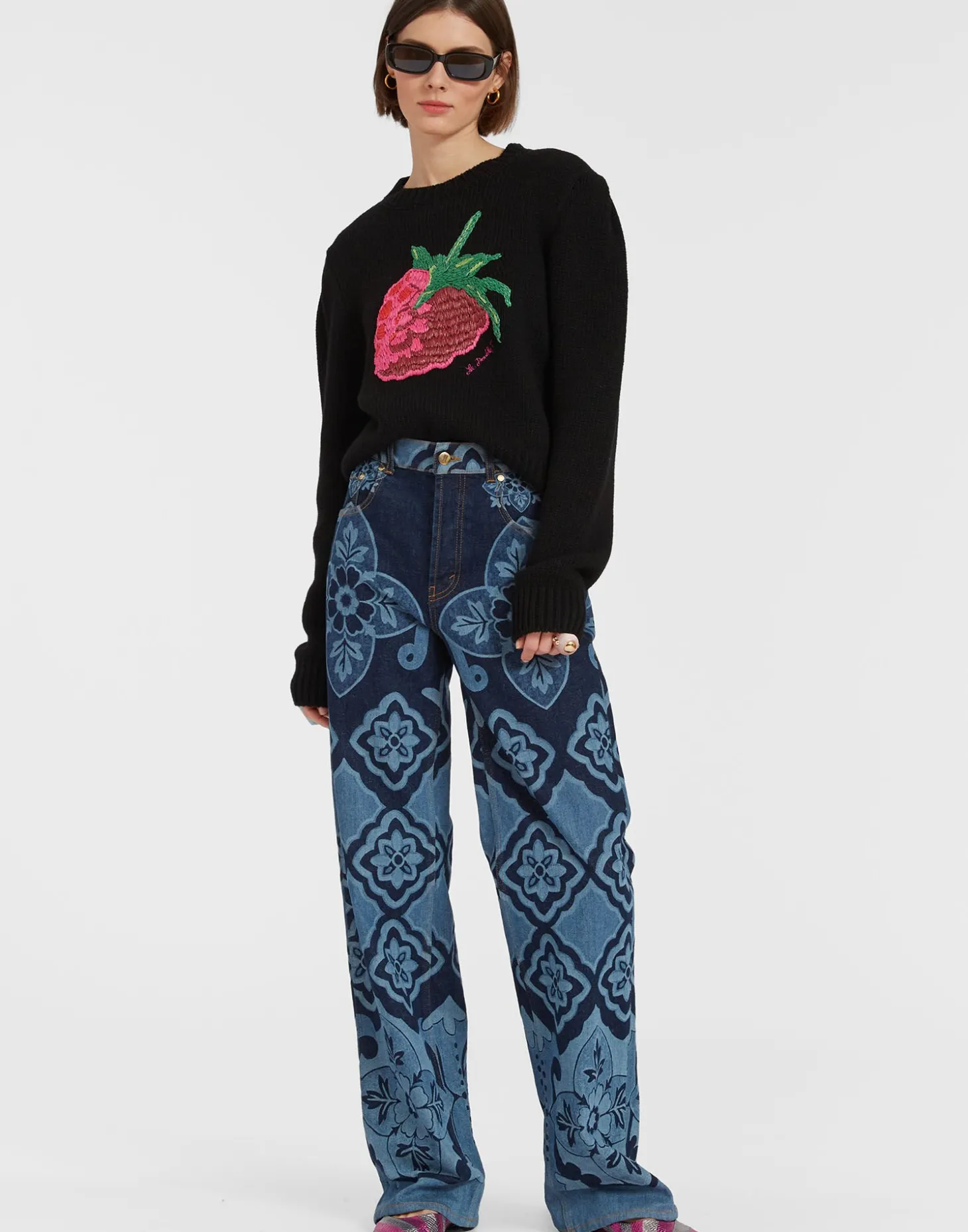 Don’t get us wrong, we love ourselves a bit of Italian summer, but sweater weather just might be our favorite season. Crafted from the most I-just-wanna-curl-up-in-this-forever-soft fine Merino-cashmere blend, this all figure-flattering sweater hits right at the hip, with ribbed cuffs and a gorgeous, hand-embroidered raffia raspberry across its front. Wear it with jeans or the high-waisted Comasca Pant, or with the silk Drawstring Skirt for a sweet office to aperitivo look. Sorry sisters, no #uglysweater parties here this holiday season.
