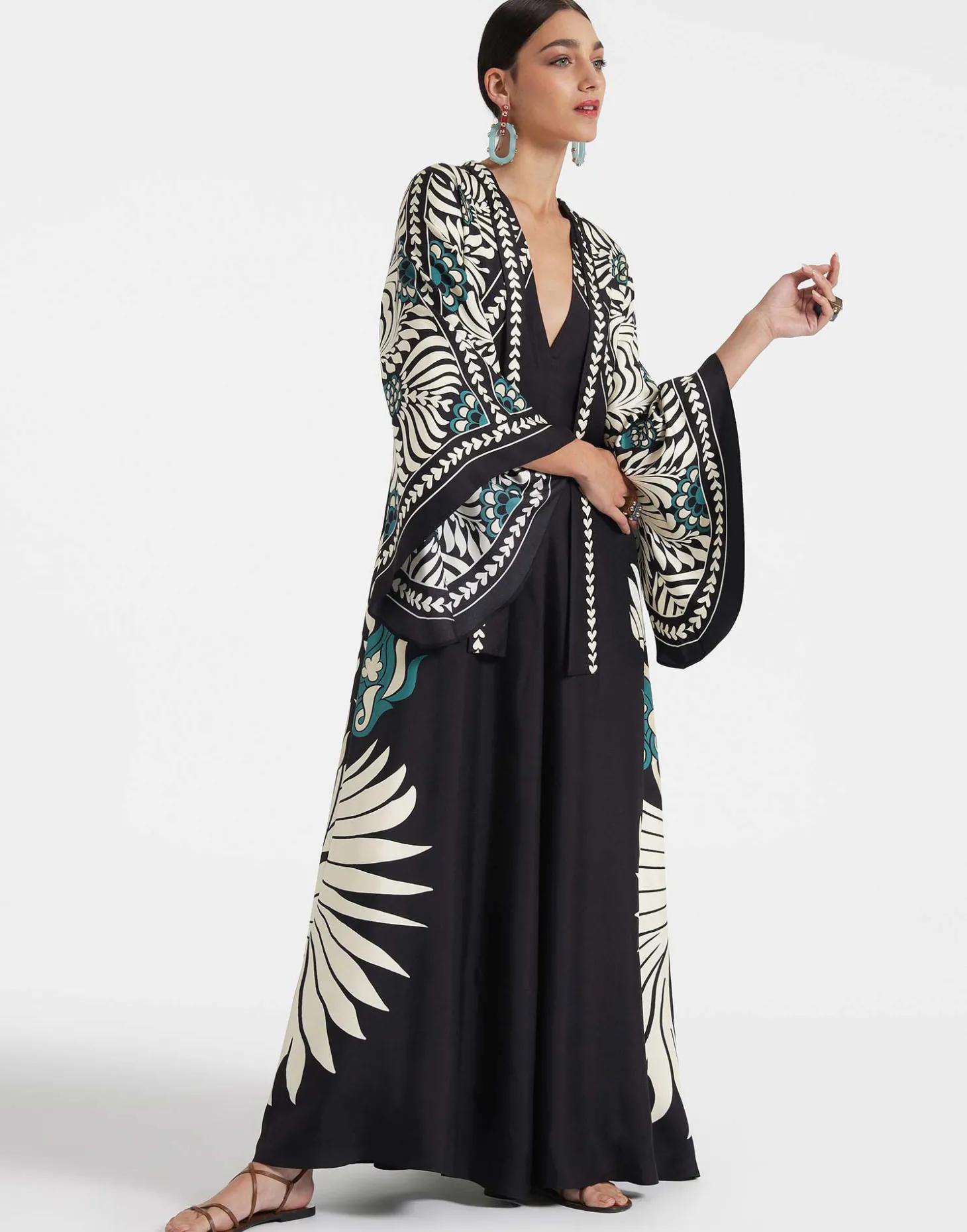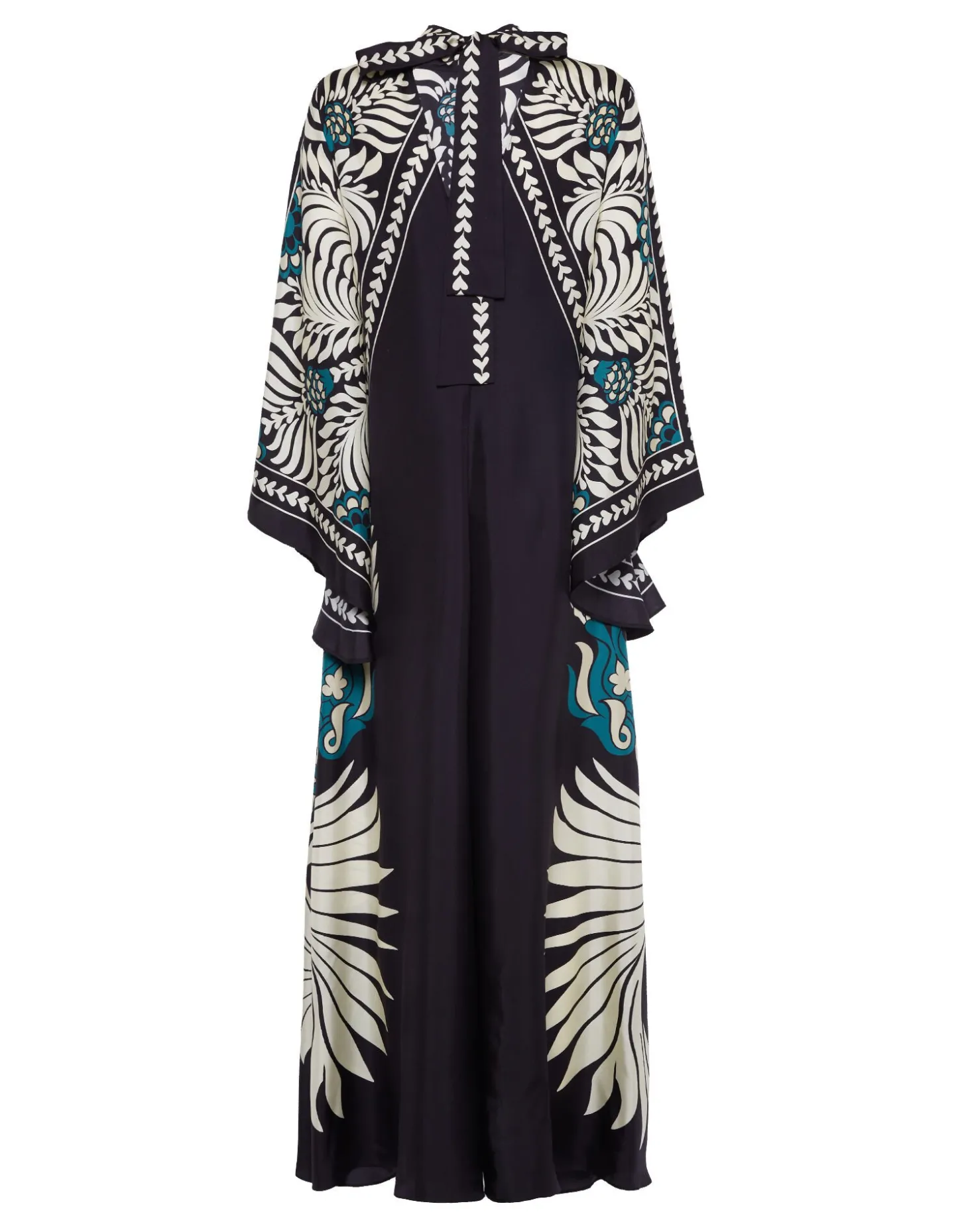 Shouldn’t every babe have a dress called the Magnifico hanging in her closet? La DoubleJ believes so! With a stand-up collar, long sash at the back and draped waterfall sleeves, this special number will glide you around the room with an ease and an elegance reserved for the most exclusive of occasions. Cut in Como-made silk it arrives in this beguiling hand-placed print brimming with mystique and allure, destined for a decadent palazzo party and perfect for mediumalists and maximalists alike.