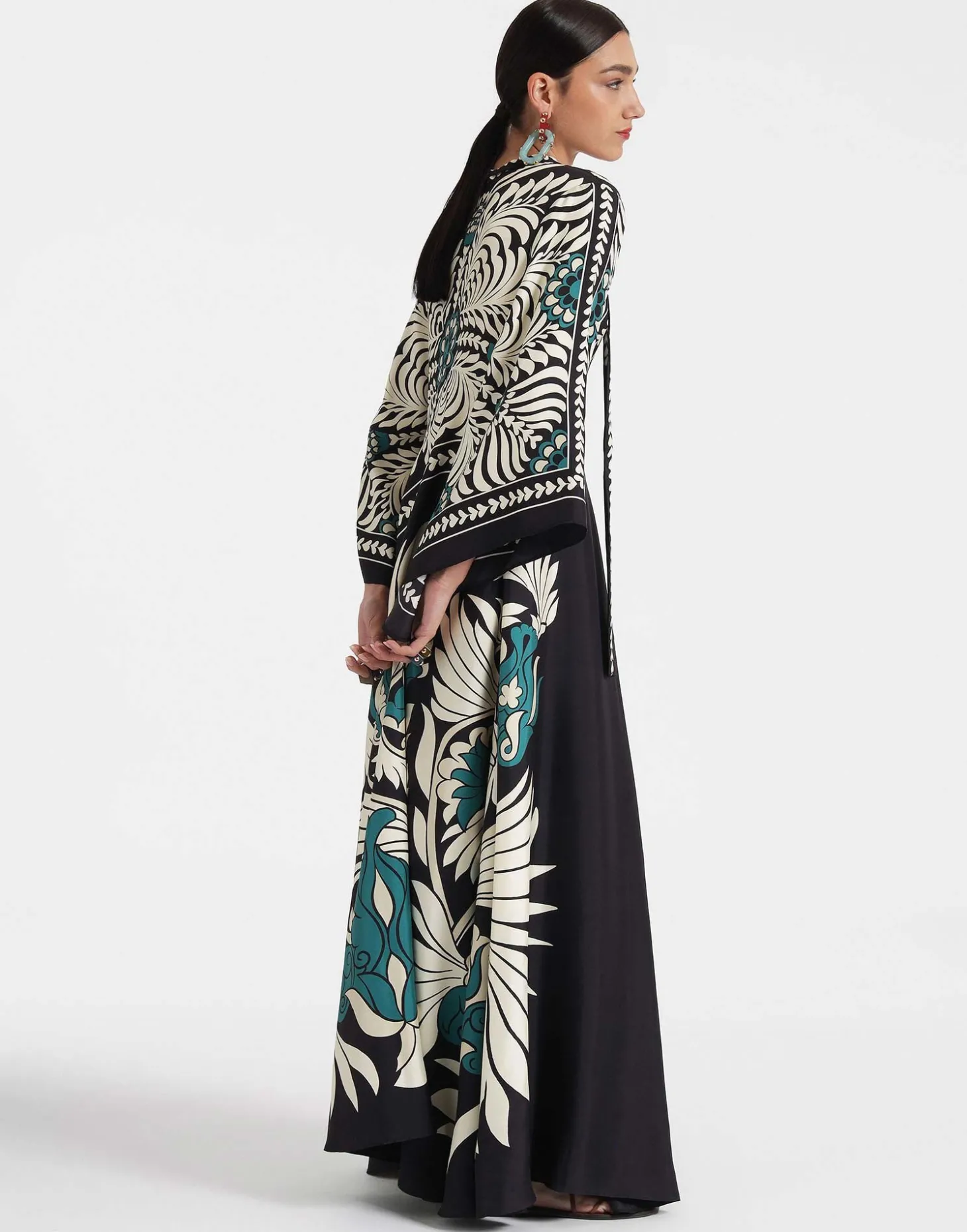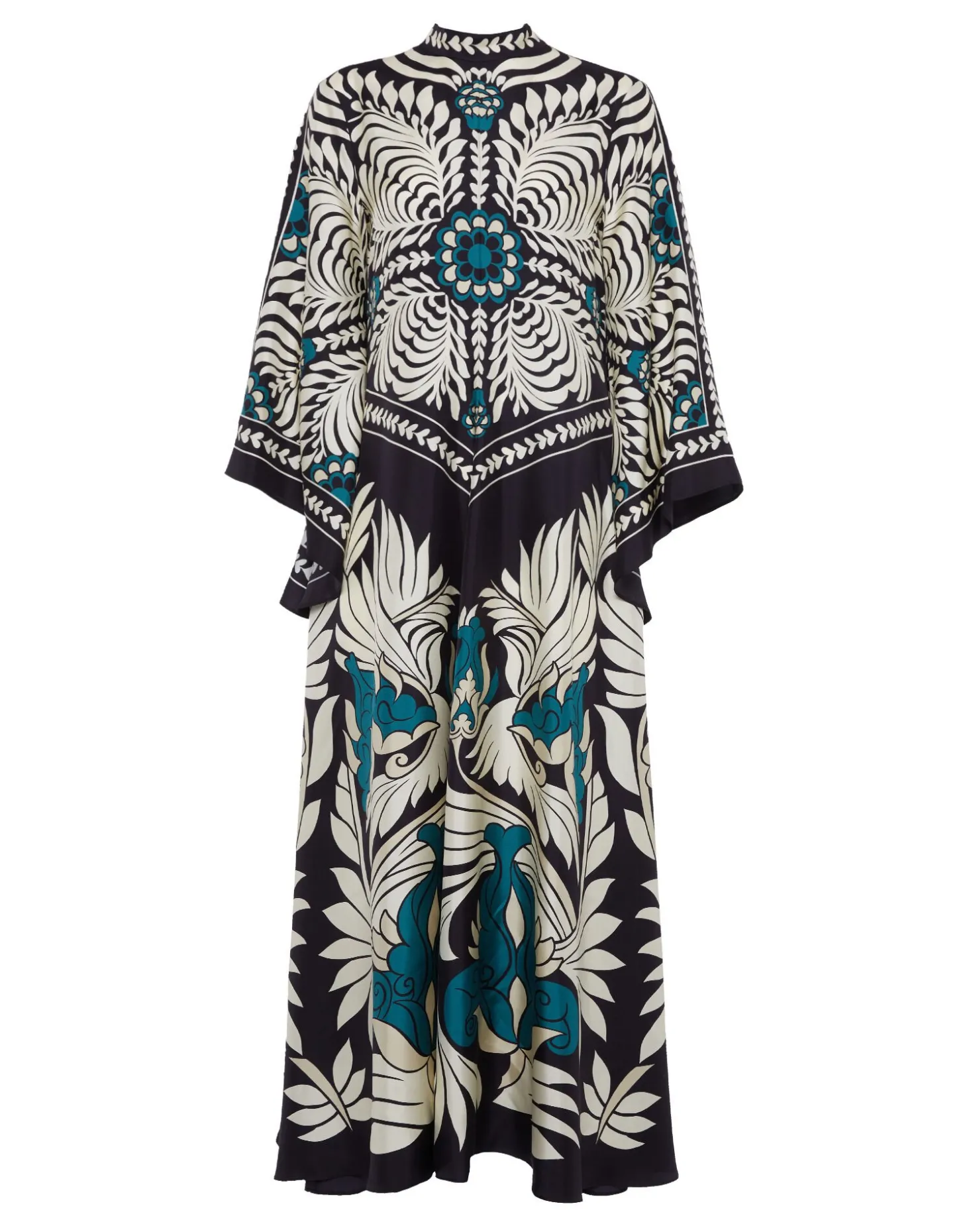 Shouldn’t every babe have a dress called the Magnifico hanging in her closet? La DoubleJ believes so! With a stand-up collar, long sash at the back and draped waterfall sleeves, this special number will glide you around the room with an ease and an elegance reserved for the most exclusive of occasions. Cut in Como-made silk it arrives in this beguiling hand-placed print brimming with mystique and allure, destined for a decadent palazzo party and perfect for mediumalists and maximalists alike.