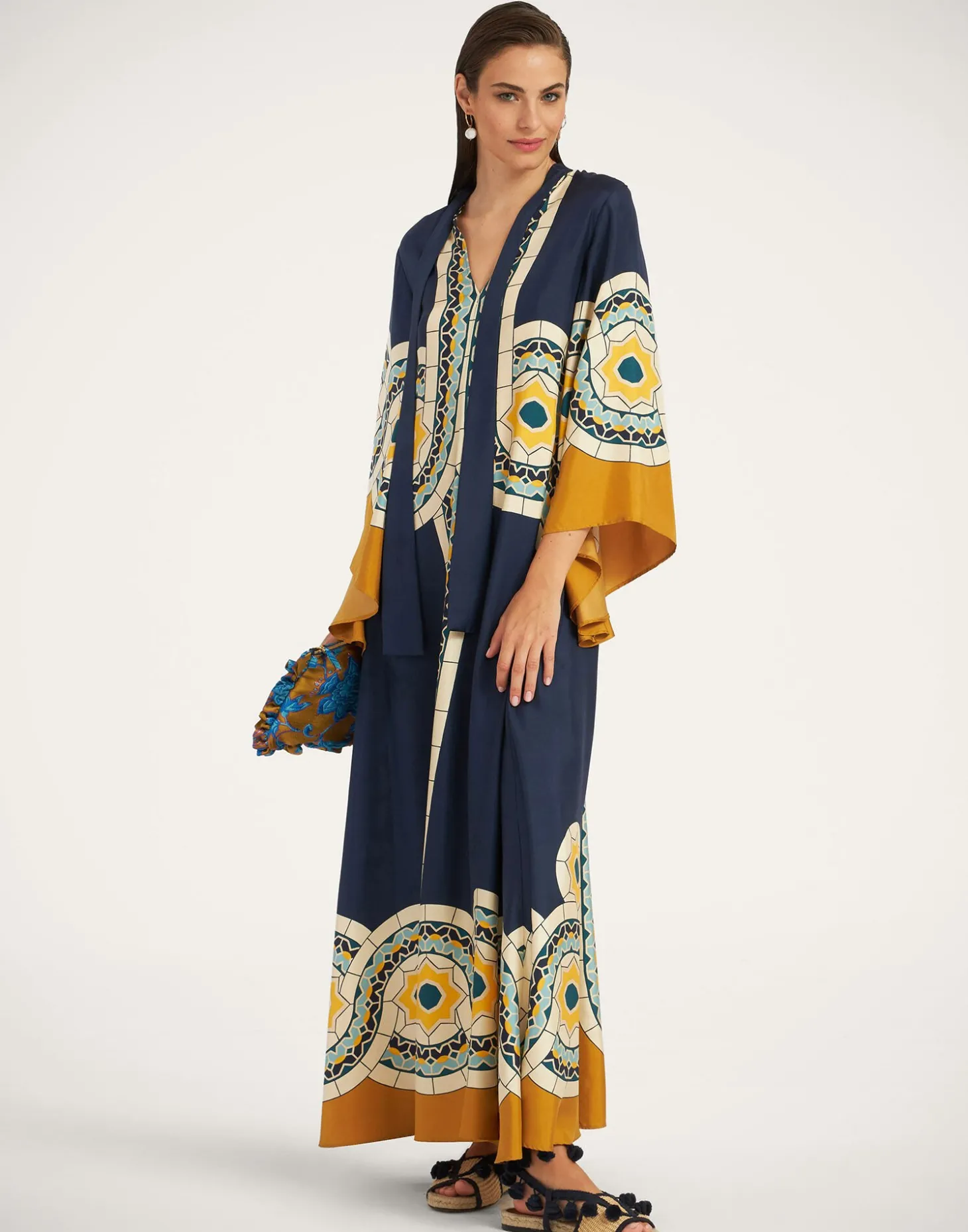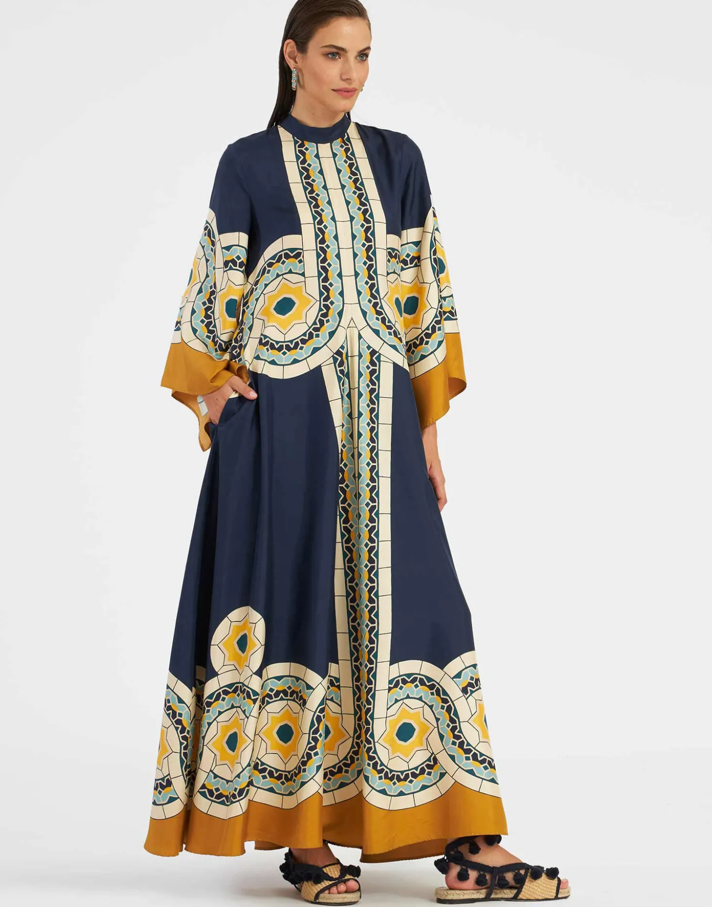 Shouldn’t every babe have a dress called the Magnifico hanging in her closet? La DoubleJ believes so! With a stand-up collar, long sash at the back and draped waterfall sleeves, this special number will glide you around the room with an ease and an elegance reserved for the most exclusive of occasions. Cut in our Como-made silk twill with a subtle sheen, it exudes chic Italian elegance in this art deco print, exquisitely placed by artisan hands.