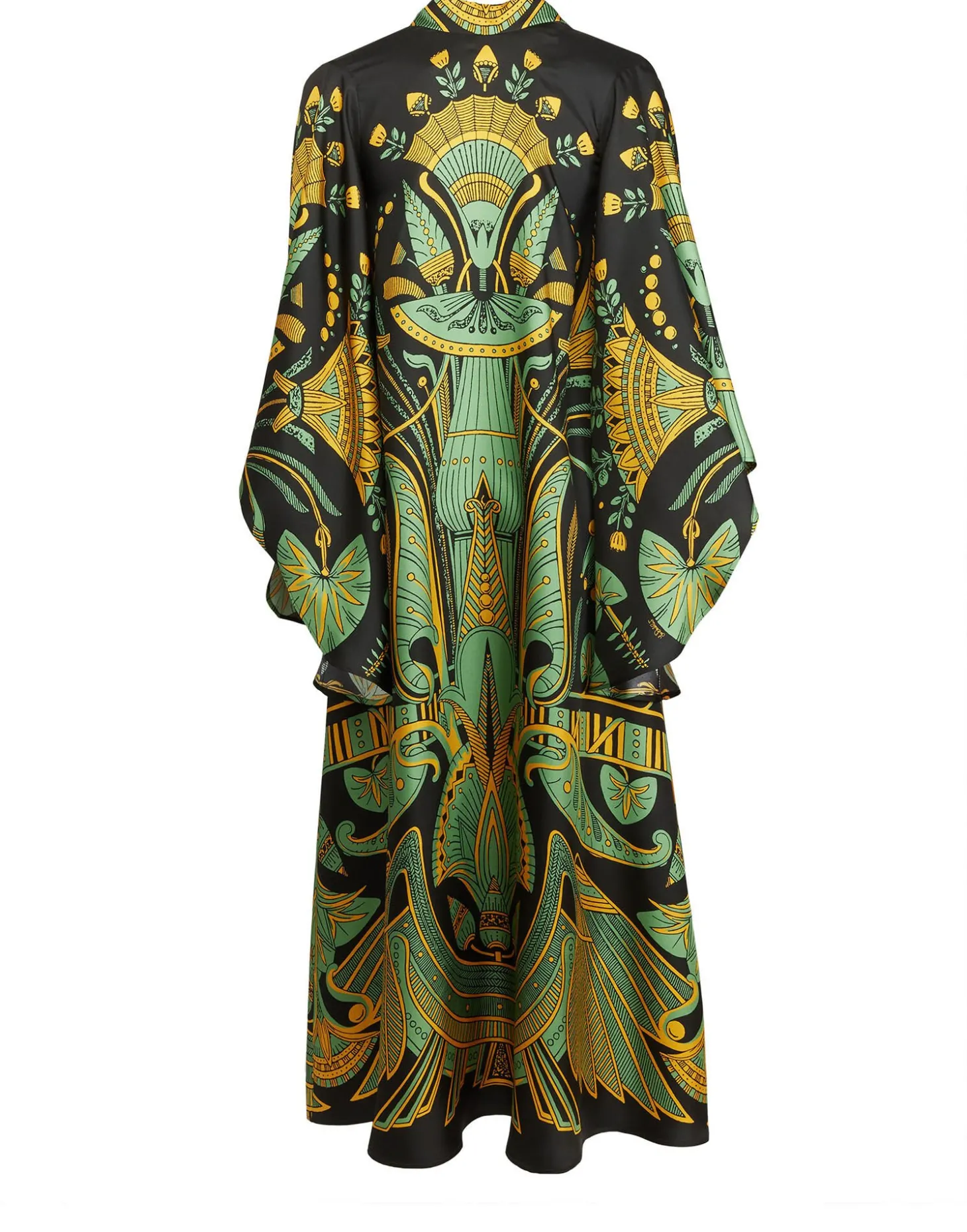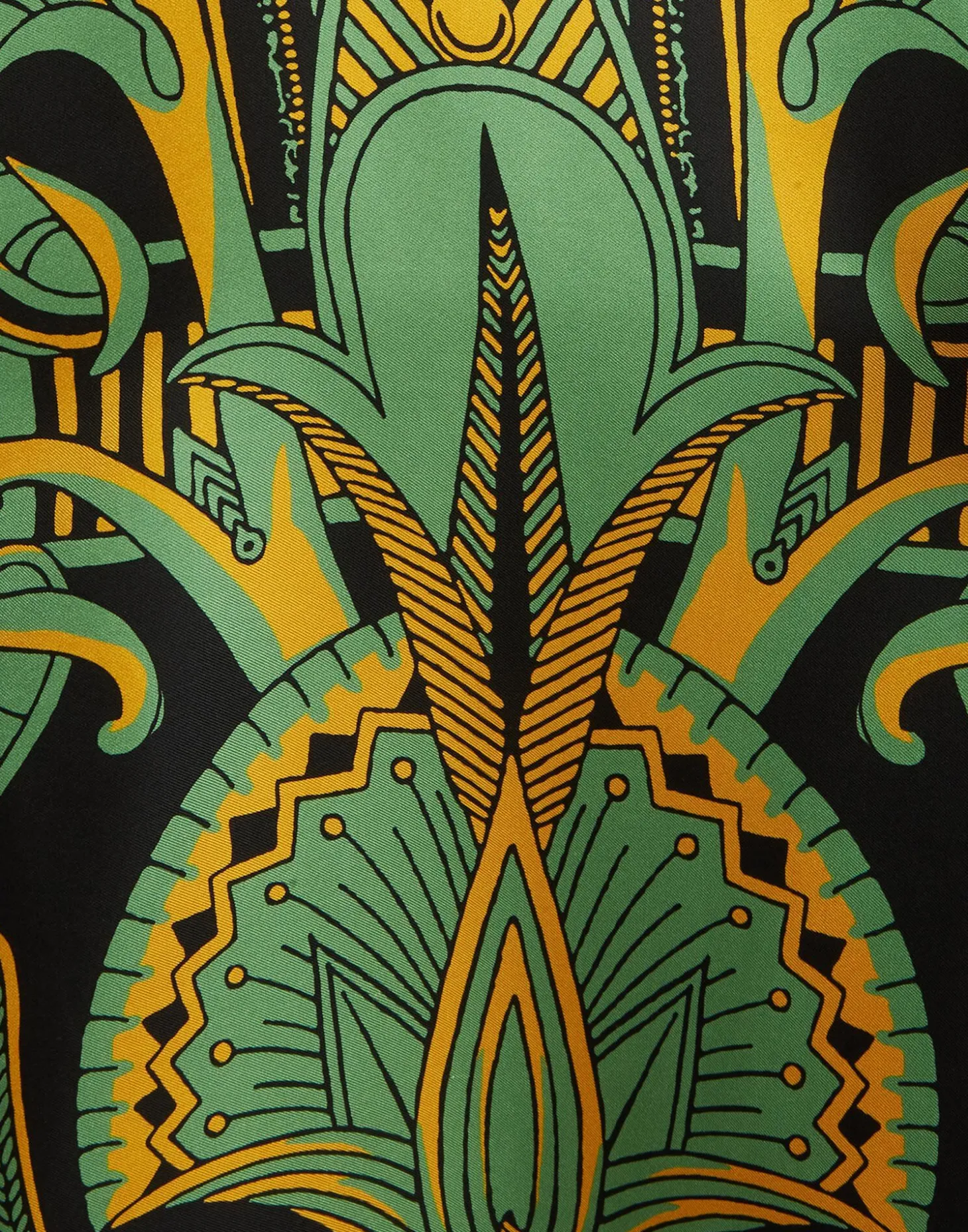 The Magnifico Dress you all know and stun in, but cut with a shorter midi hemline to bring more opulence to your day-to-night wardrobe. Like its sister it features a stand-up collar, long sash at the back and draped waterfall sleeves, and is cut in our luscious silk twill which has a subtle weave and sheen. Inspired by J.J.’s journeys through Egypt, this Nile motif is made all the more captivating, printed by hand to fall perfectly every time. Do as she does and reverse it for an equally beguiling look!