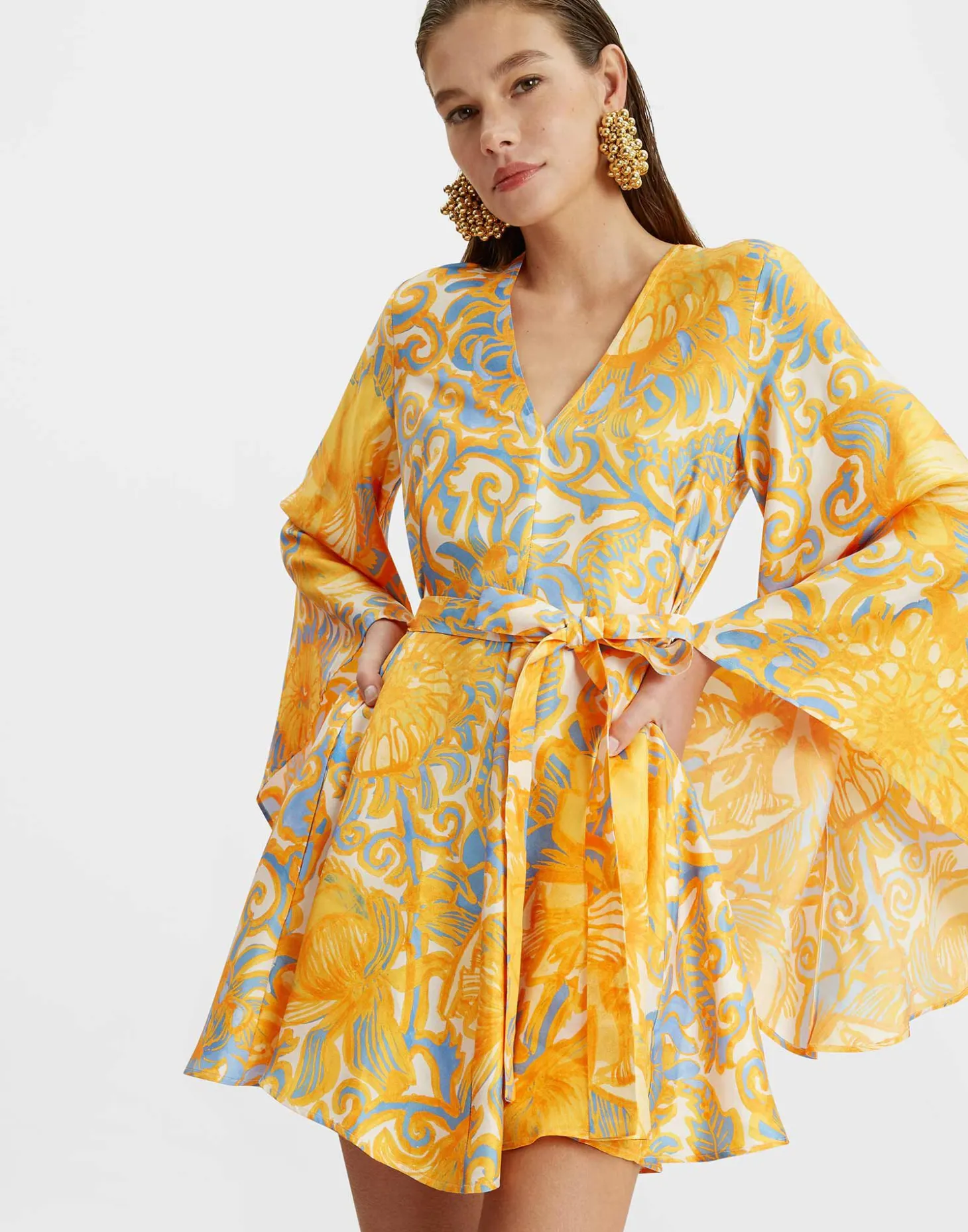 We love our best-selling Magnifico SO much, we made a mini version! Same delicious deep V. Same dramatic, flowing bell sleeves. Same 100% Italian silky twill. New, sexy, thigh-skimming hem. Just as gorgeous on our leggy LDJ ladies as our petite principessas, the Mini Magnifico comes with a removable sash that can be worn as a belt and, as always, perfectly concealed pockets. An elegant evening number that can be worn cinched, free-flowing, backwards, forwards…basically she’s the ultimate summer workhorse, with a little extra wonder thrown in.