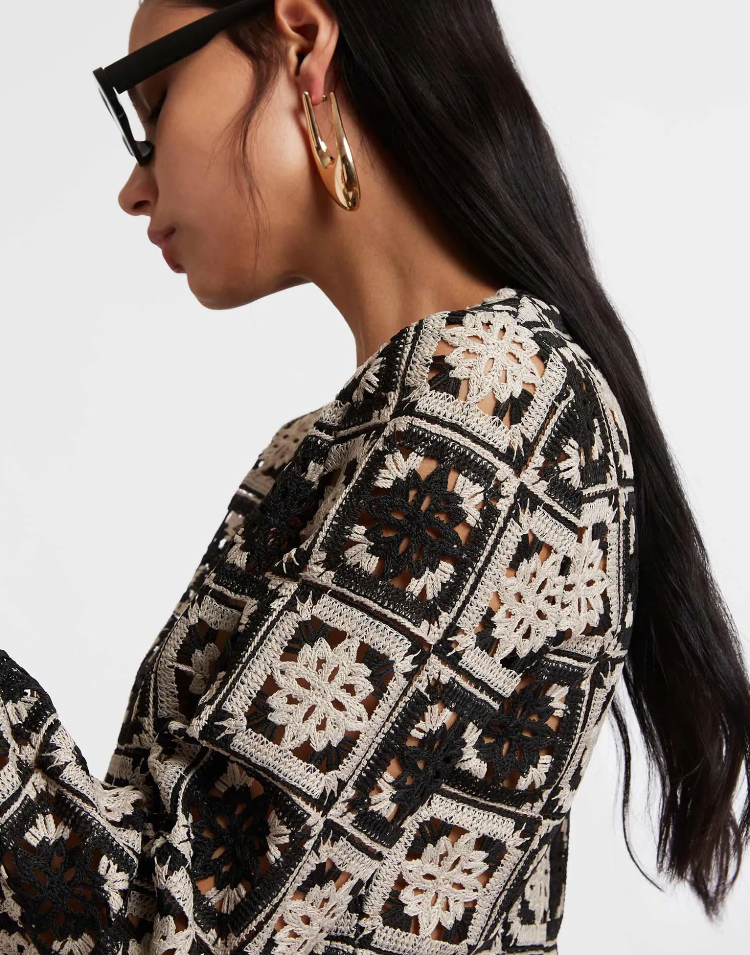 A short but chic cocktail dress ready to enter your party era. Whatever celebratory occasion you’re dressing up for this season, the Mini Supremes aims to flatter, with its long fluted sleeves and thigh-sitting silhouette expertly cut on the bias to hug in all the right places. This version arrives in our fabulously festive macrame fabrication for a timeless, flounce-ready flourish.