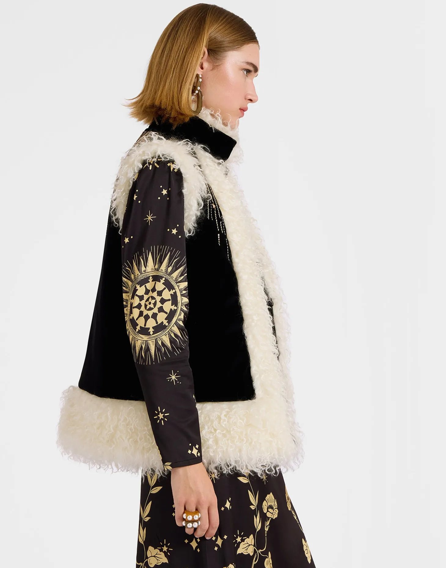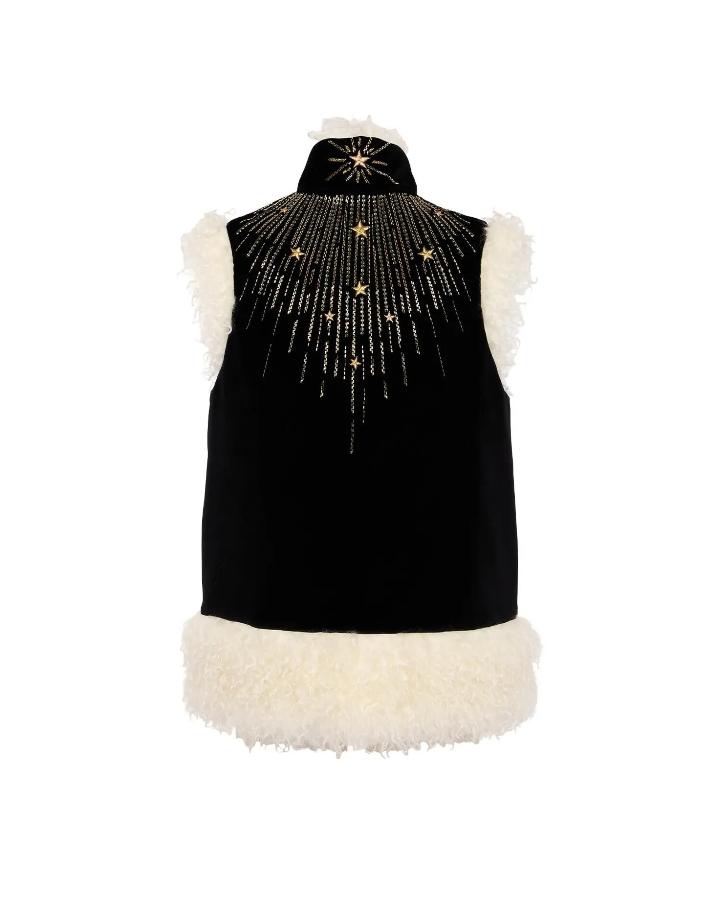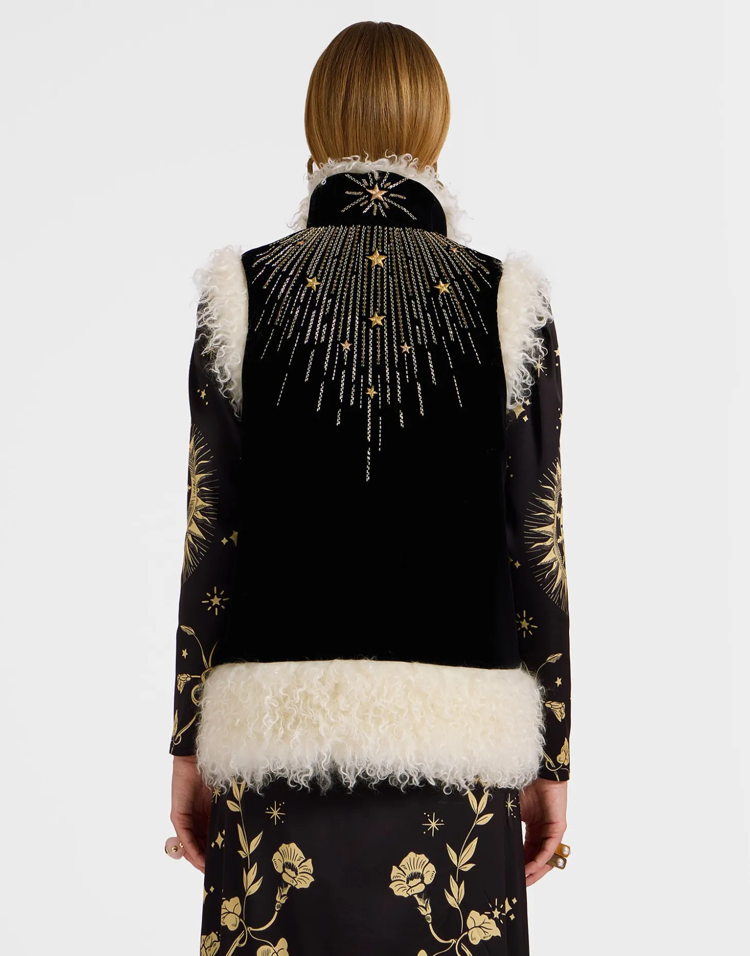 If we have one tip for you this season it’s to get into gilets. In homage to the iconic Afghan-inspired sheepskin coats that were the cornerstone of late 60s celebrity style, this version arrives crafted in our solid Italian velvet with gold embroidery, so, yeah, its pretty special. Trimmed with a cozy wool collar, its boxy shape and roomy armholes makes this the perfect layering piece for all your wanderlust winter sojourns. Throw it over the big-sleeved Poet Shirt, Big Shirt Dress or anything just as voluminous.