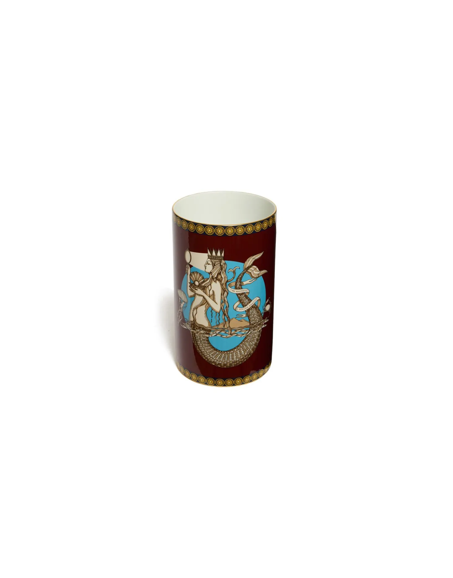 An iconic symbol of divine beauty, the Mermaid is equal parts femininity and fortitude. The queen of our emotions, we see her here rising from the depths of the ocean, captured to beautiful effect by artist Elisa Seitzinger. As one of our Guardians, she serves as the custodian of your sensuality and your heart, making this 18K-gold trimmed Pillar Vase the perfect present to your beloved or as part of your personal collection to help fortify your feminine energies.Crafted in collaboration with Turin-based artist Elisa Seitzinger, the Guardian Collection features five energy-protecting supernatural stewards;The Unicorn; The Sphinx; The Angel; The Dragon: The Mermaid. With intricate hidden symbols lovingly etched, painted or printed onto each piece, these are more than mere beautiful objects – these are vibration-raising, mood-boosting, positivity-bringing happiness generators. Select the specific Guardian that activates your desired energy, or collect all five for maximum cosmic consciousness.If so moved, feel free to use this mantra with your Guardian item: “I surrender to the depths of the Divine Feminine”