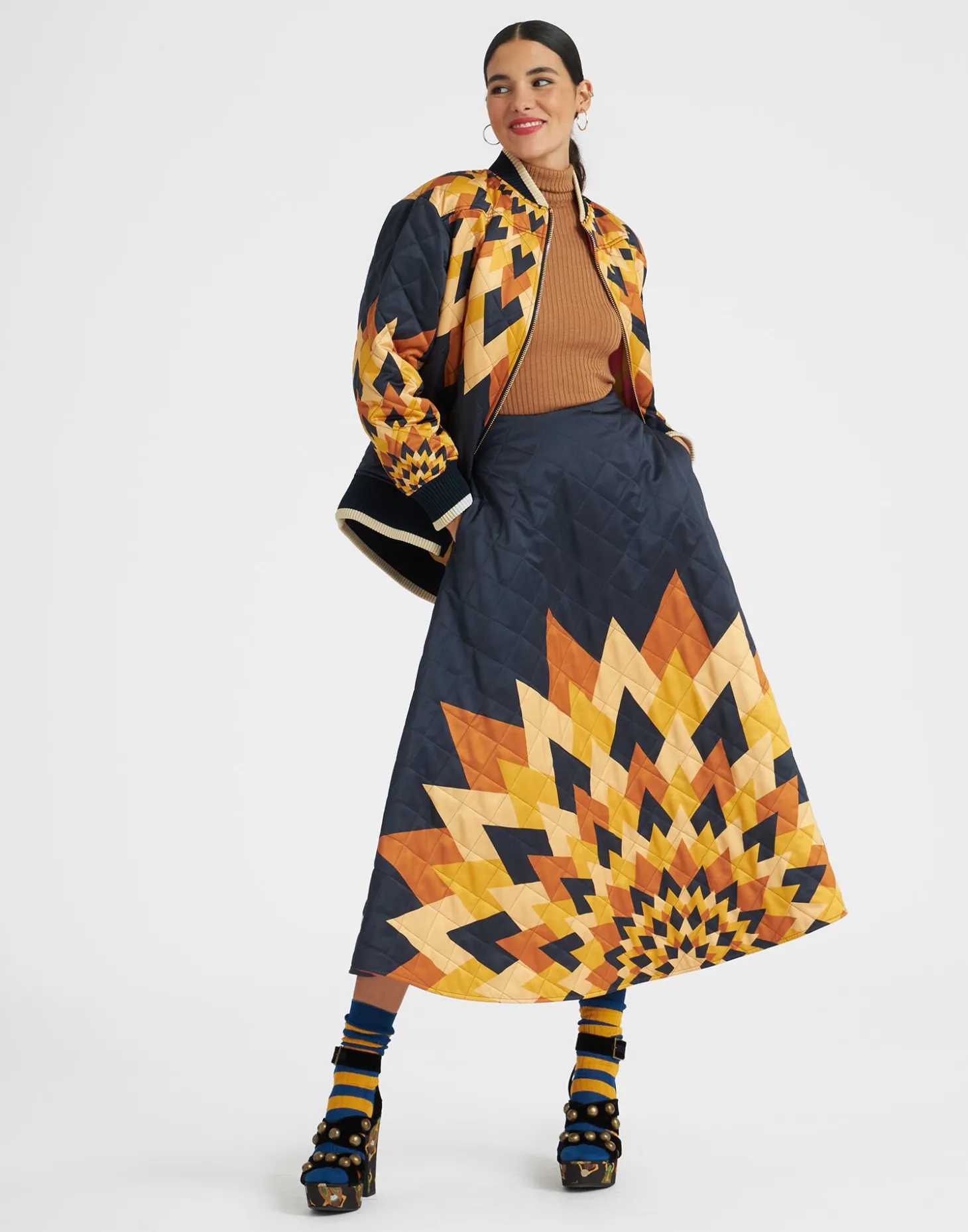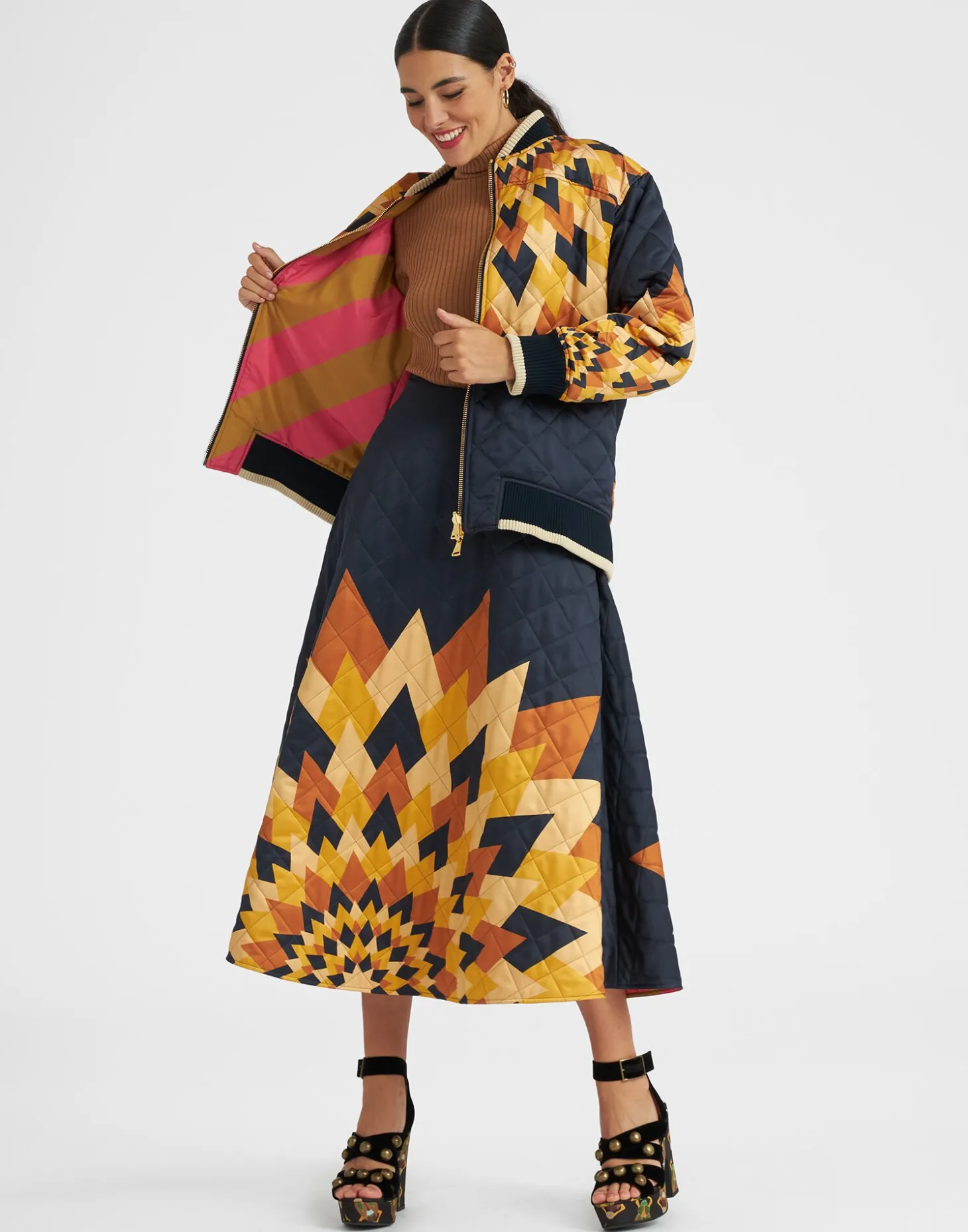 You know those girls who always look on point, without even trying? This is her jacket – The Suki is an oversized quilted bomber with a retro knit collar and cuffs that feel both retro and modern at the same time. With extra ample sleeves and a little bit of shine, she stands out whether paired with your favorite pair of jeans or with her matching Suki Skirt. Want to take her to the next level? Throw her over a full length floaty gown like the Visconti for a guaranteed “who IS she?!” air.