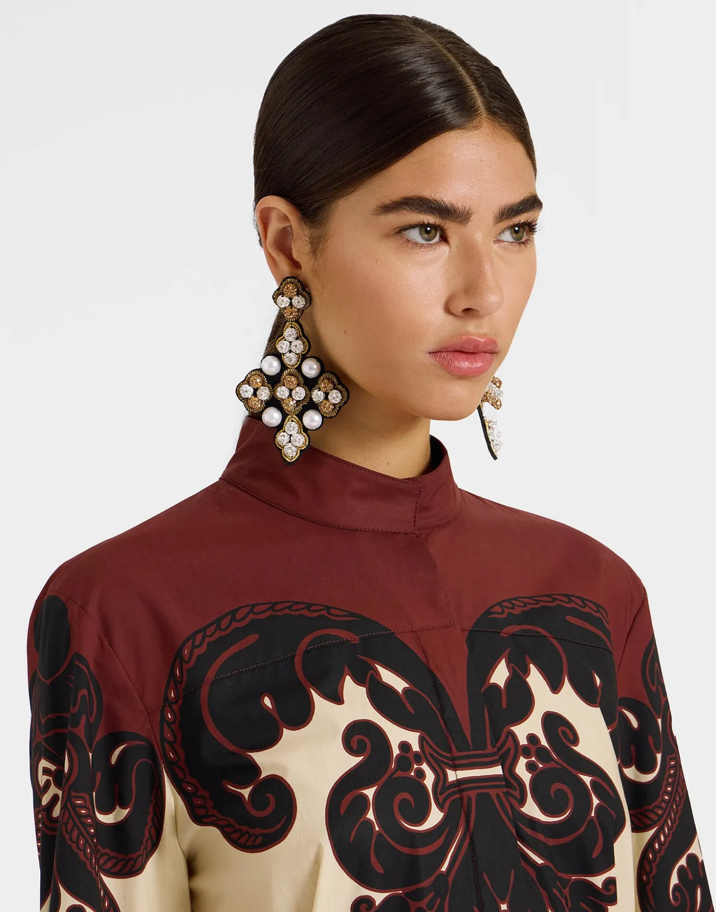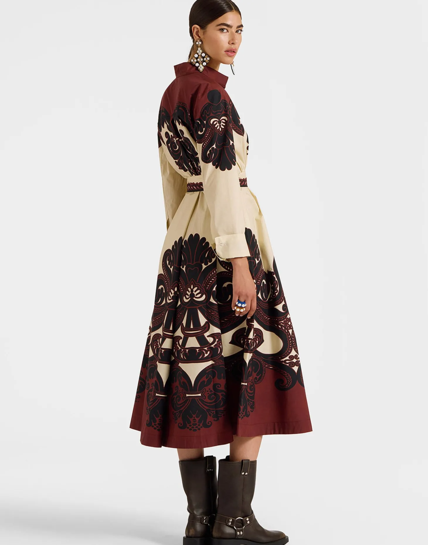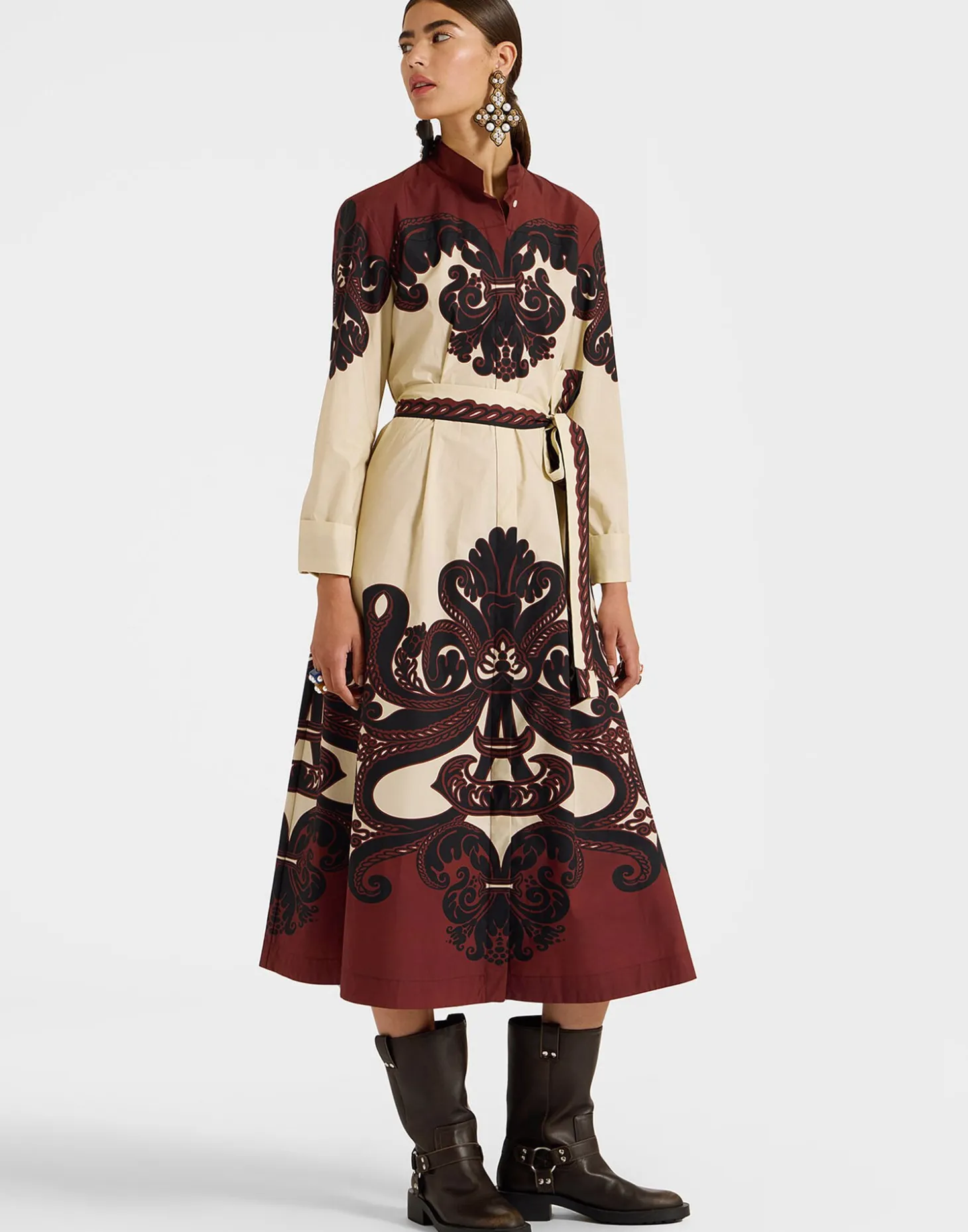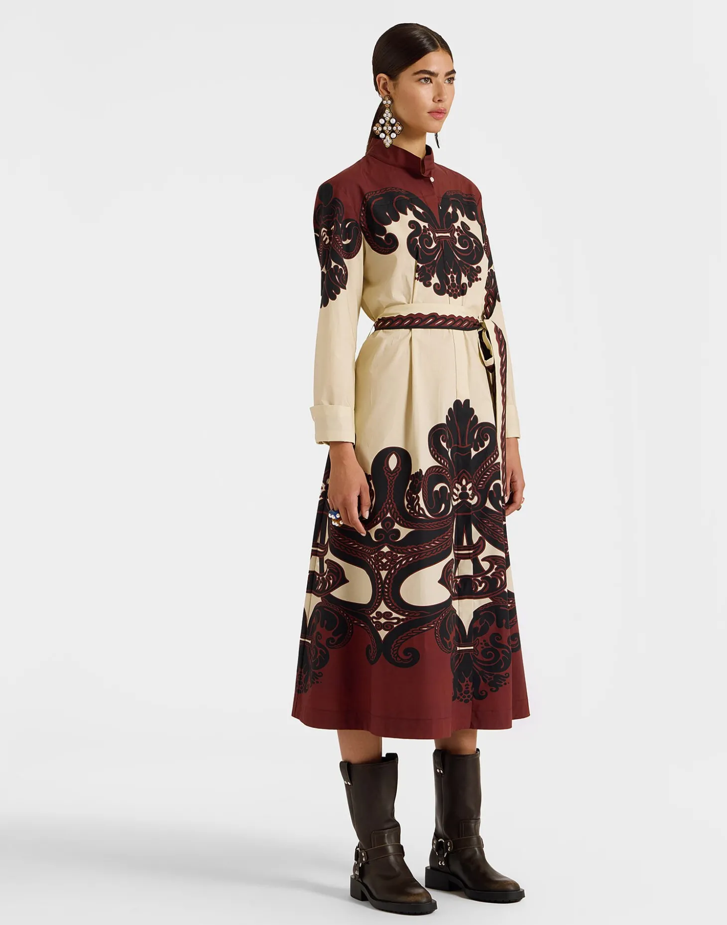 As smart as it is serene, our Sundowner shirtdress will take you from boardroom to beach sunset in a snap. Crafted in our crispy cotton poplin, it features a Korean collar, concealed buttons and a truly effortless silhouette that requires zero styling tricks on top. Our ultra-chic hand-placed Mudejar print deserves to mingle in a Piero Portaluppi design-scape – we’re wearing it with knee-high boots until that summer sunset arrives.