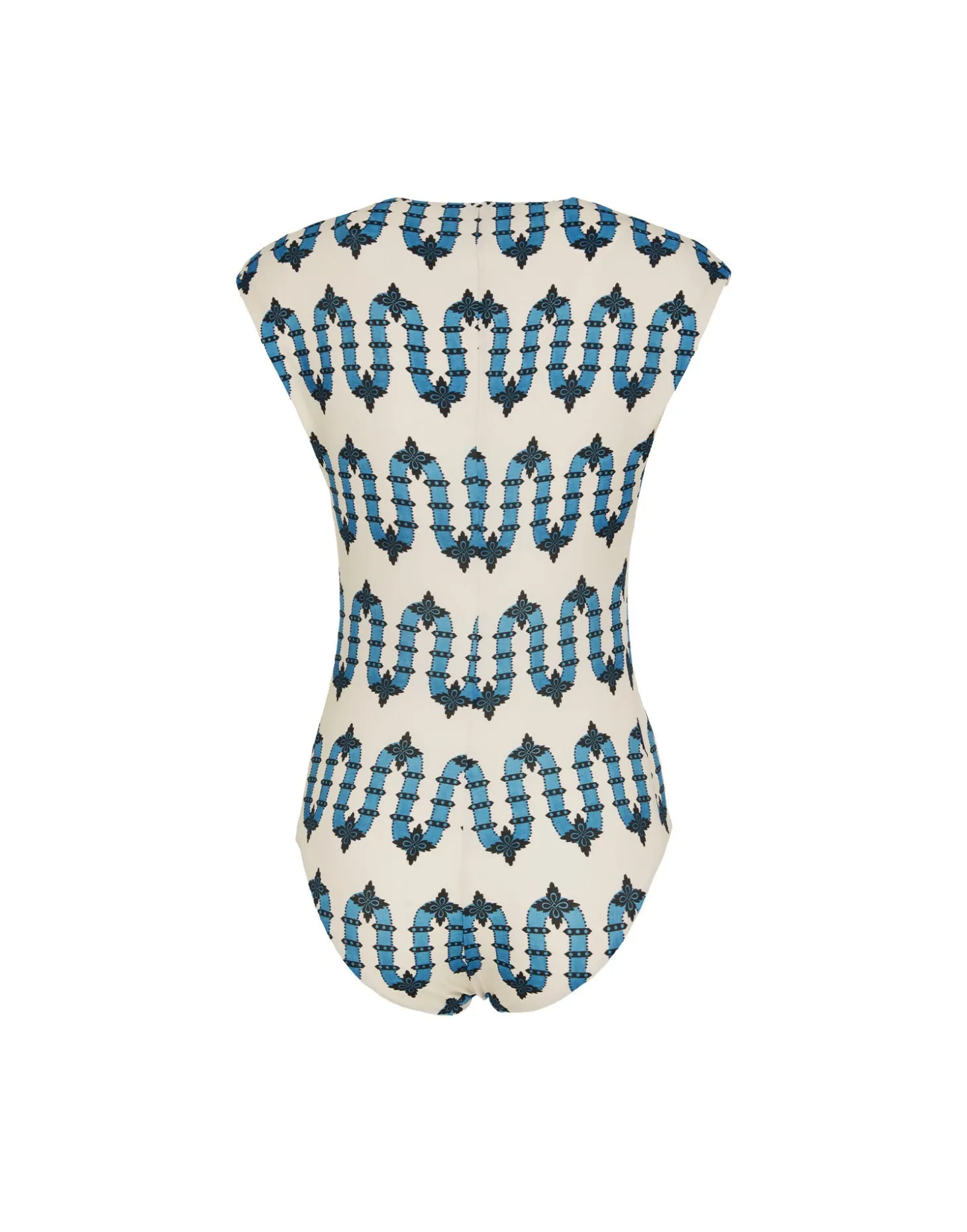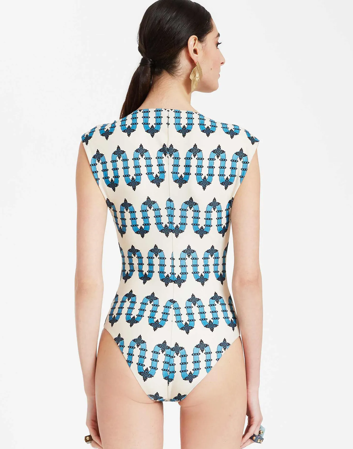 Part swimsuit, part bodysuit, the Tutto (as the name suggests) does it all. With a mini cap sleeve and and high -but-not-too-high cut hip, this is a bathing suit you can actually ride (and make) waves in. With buttons down the neckline you can make that V as deep or shallow as you wish. Gorgeous with pants and skirt, but of course she stuns solo also.