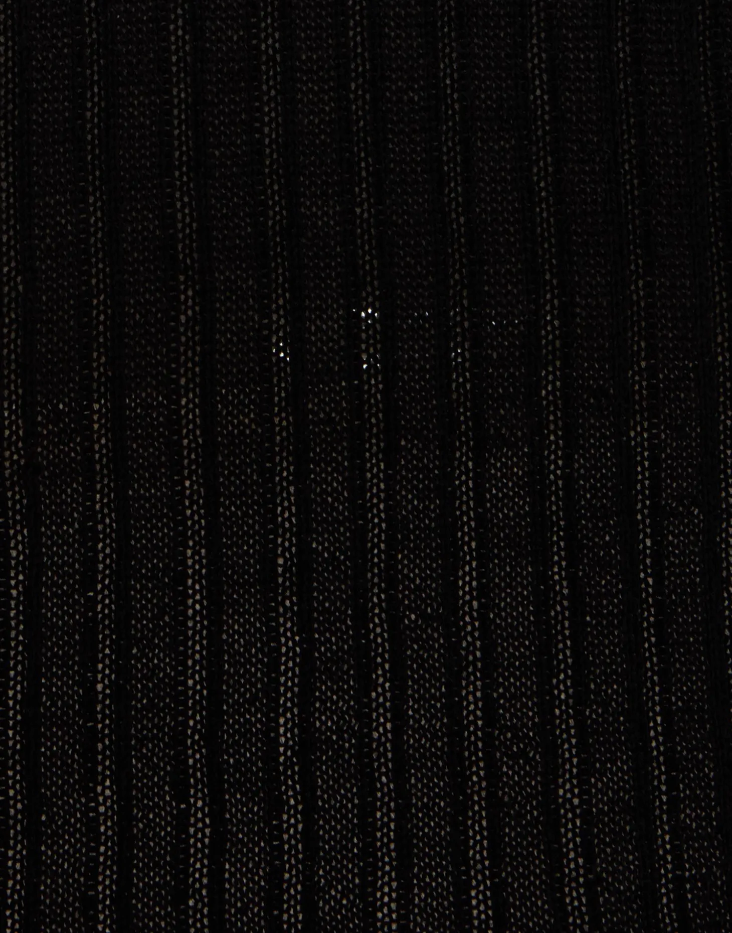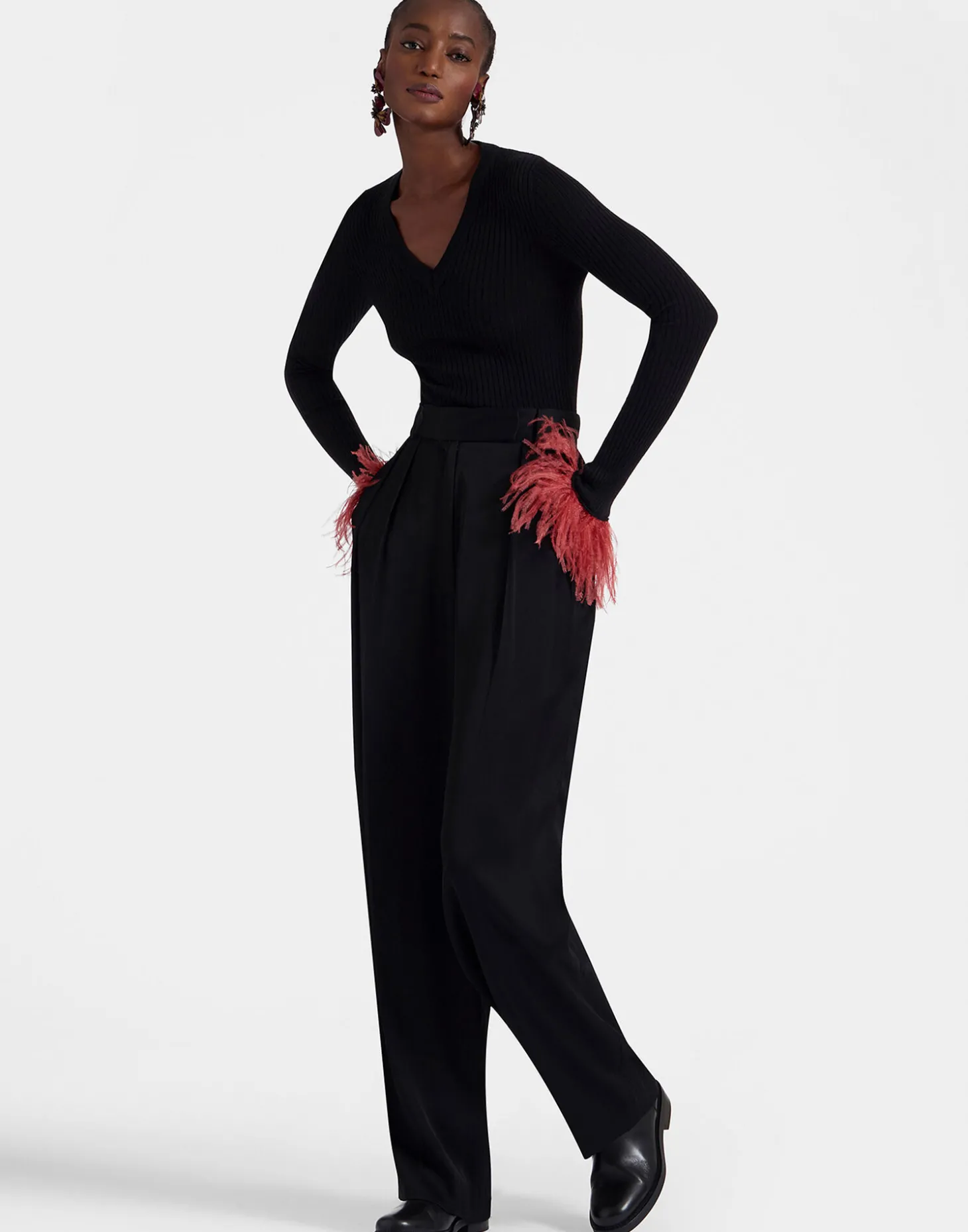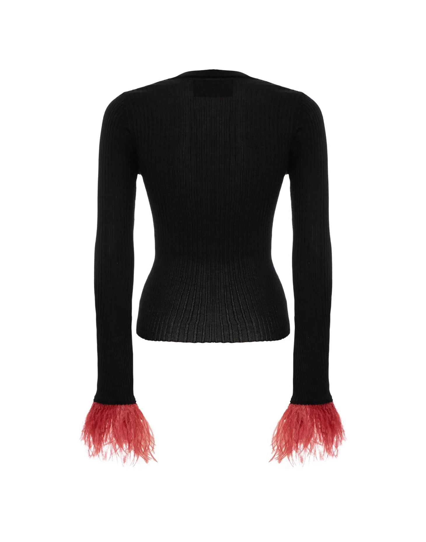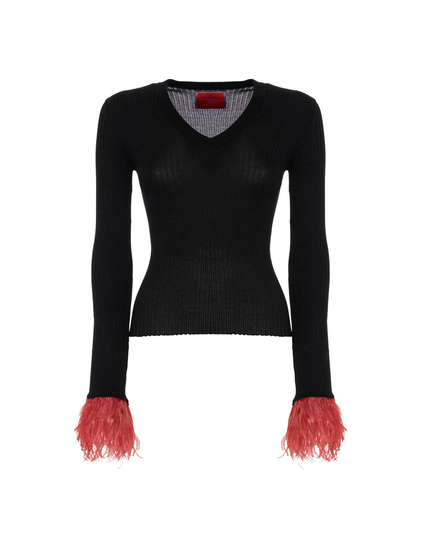 V-Neck High Kick TopSolid Black in Ribbed Silk Cashmere With Feathers