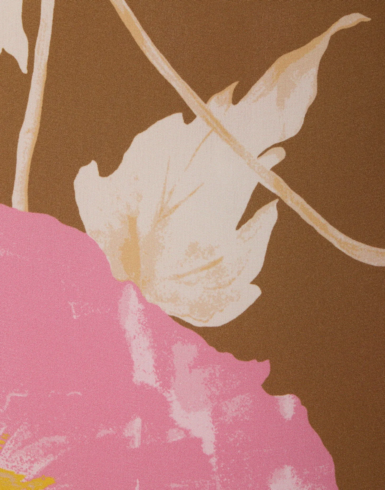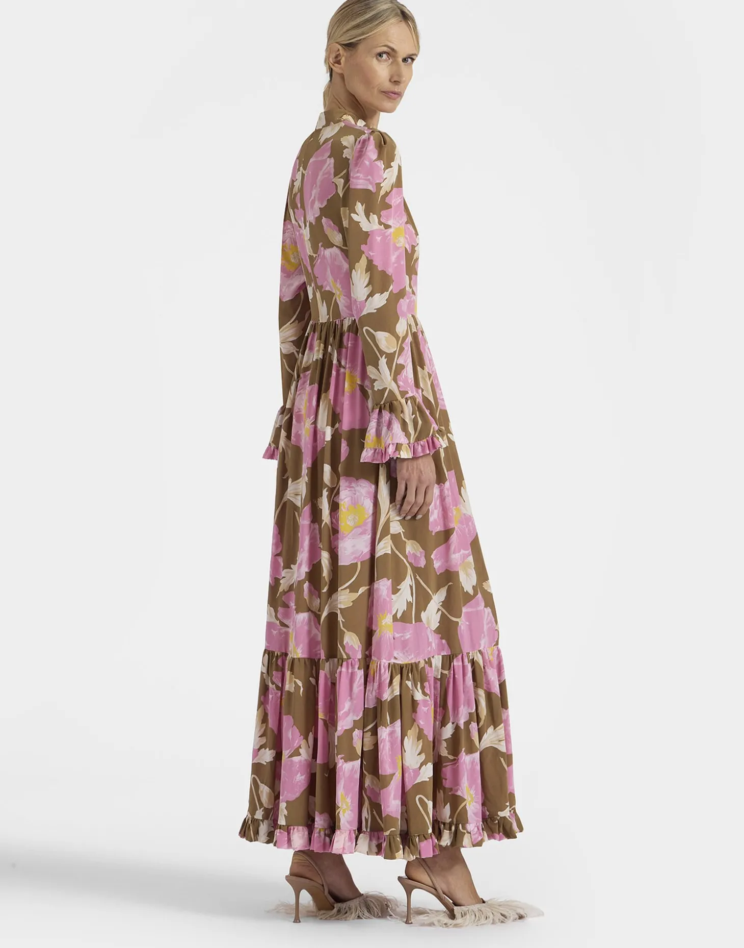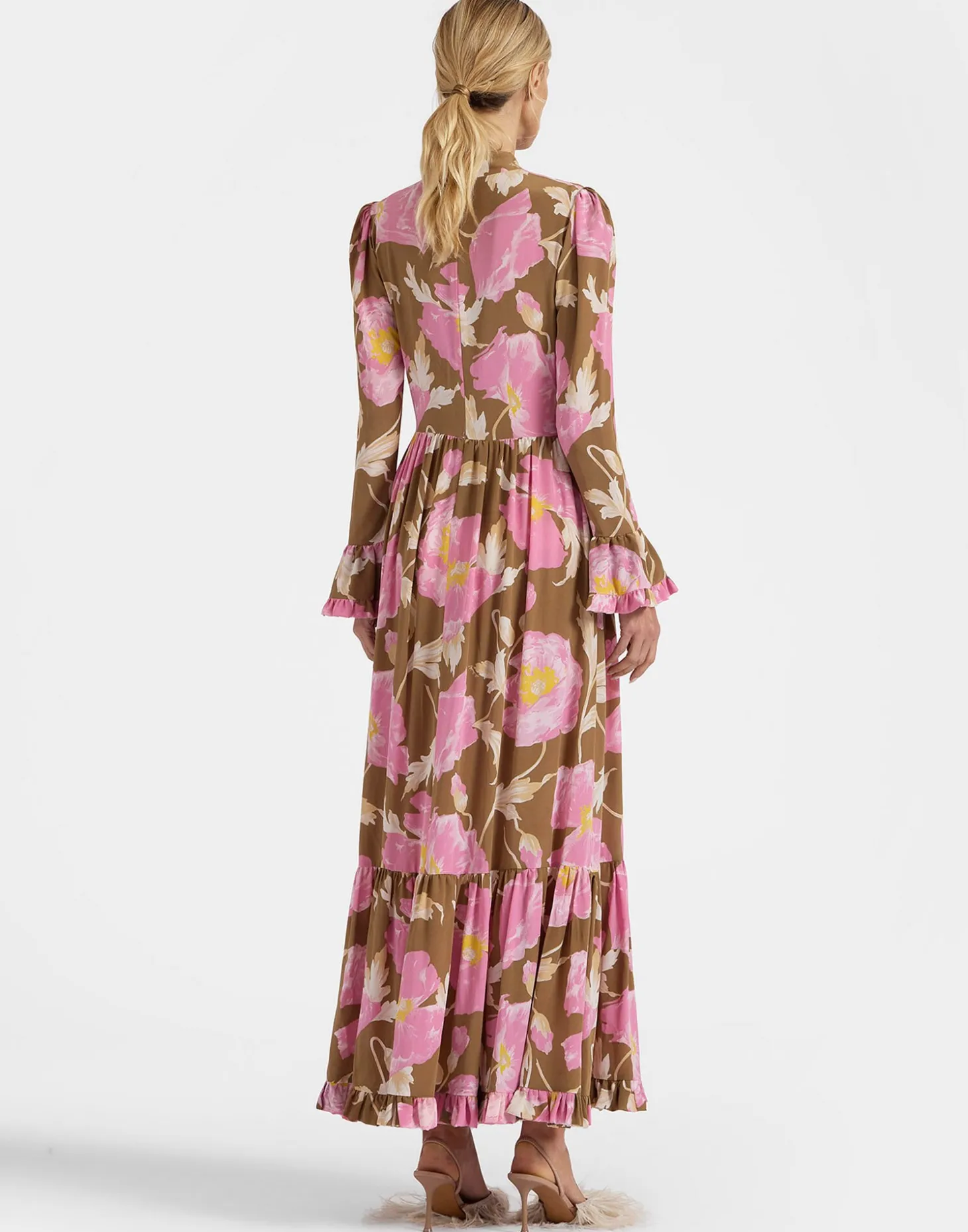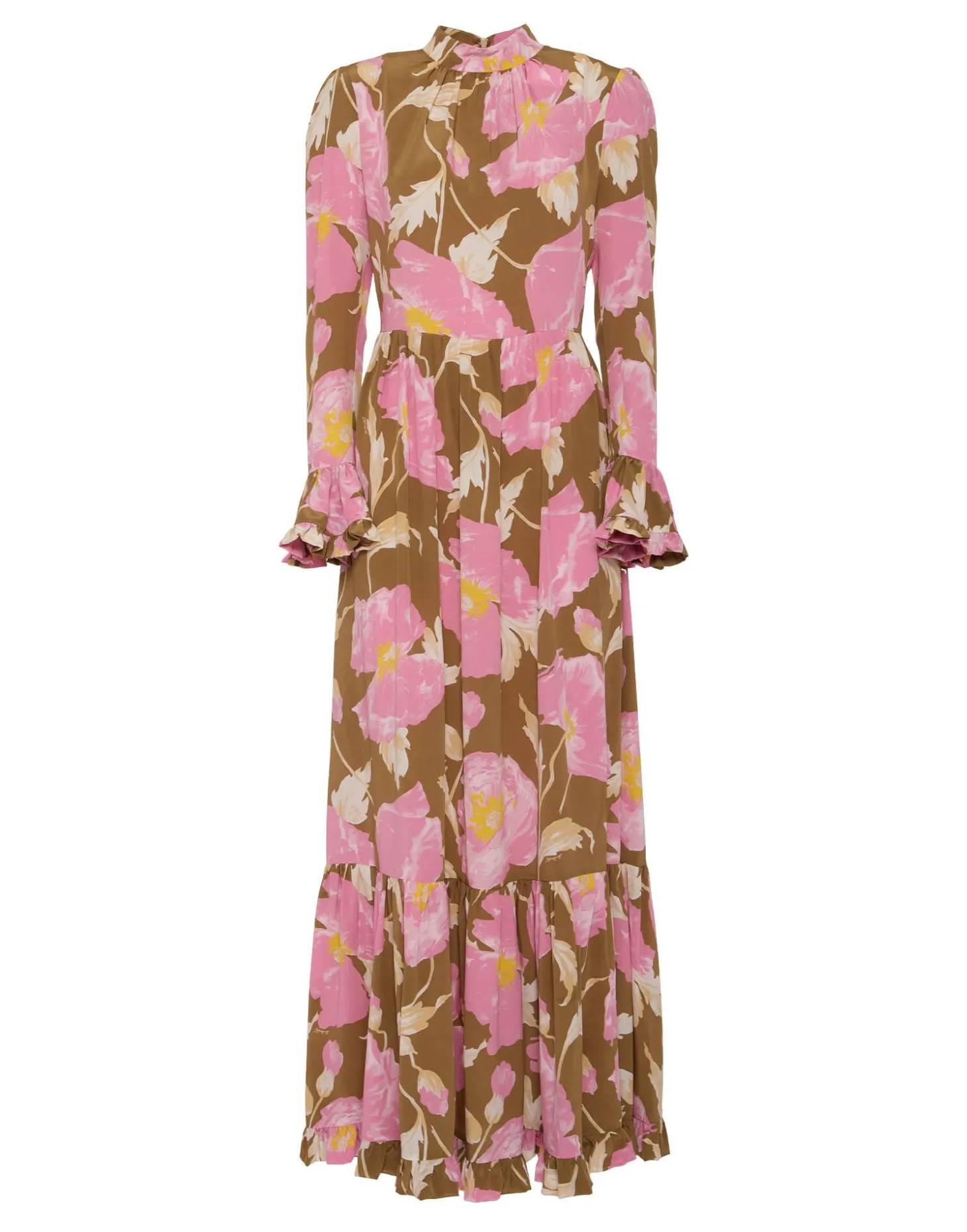 An evening dress inspired by Italy’s chicest family – palazzo not required. Crafted in our ultra-luxe silk crepe de chine that flutters and flows, this fiercely feminine beauty arrives extra enchanting in this Sylph print. Floor length with a single tier in the skirt, it has a mock neck with ruching around the décolleté, slightly gathered shoulders and sleeves that end in frilled bells. Prepare to be beguiling!