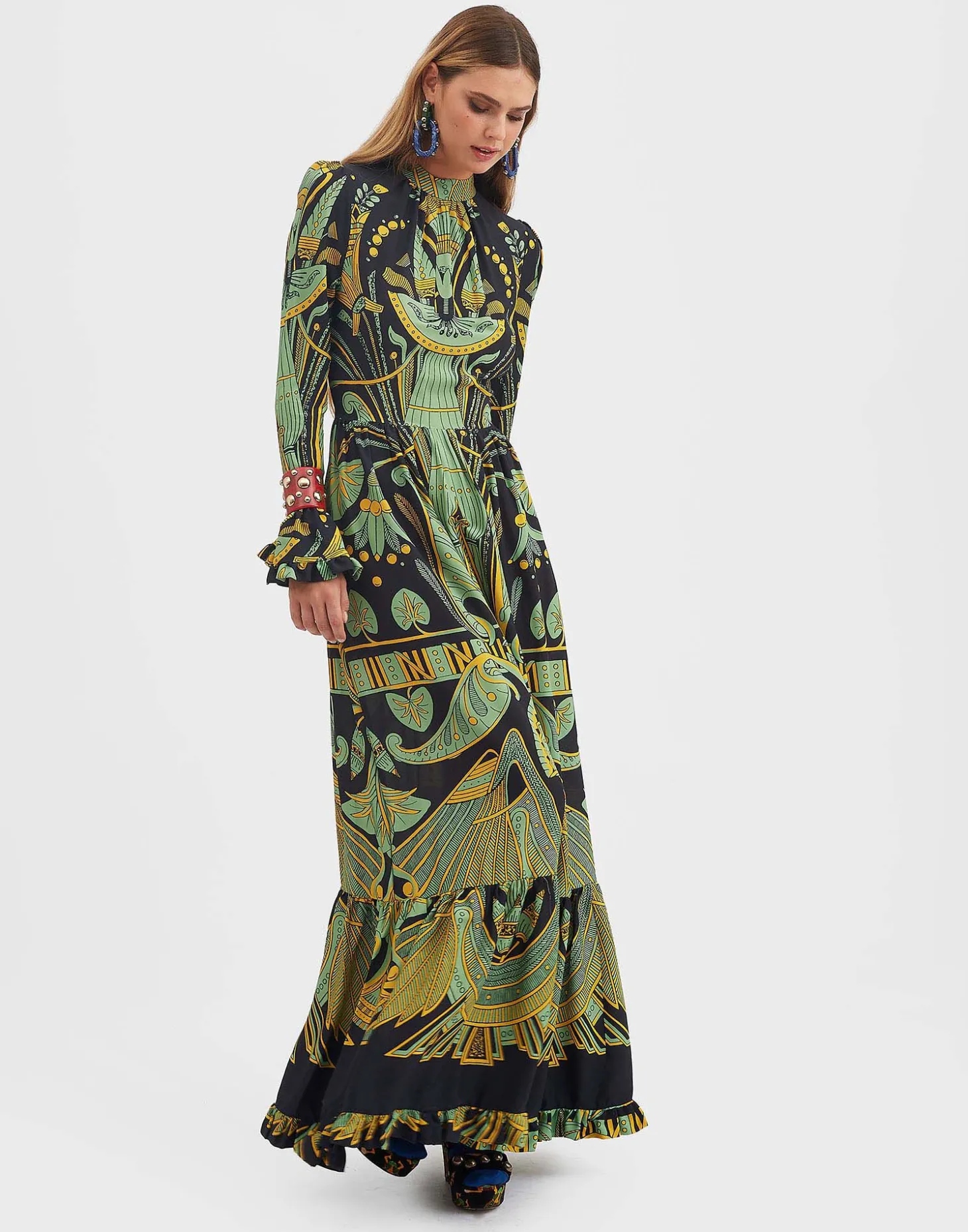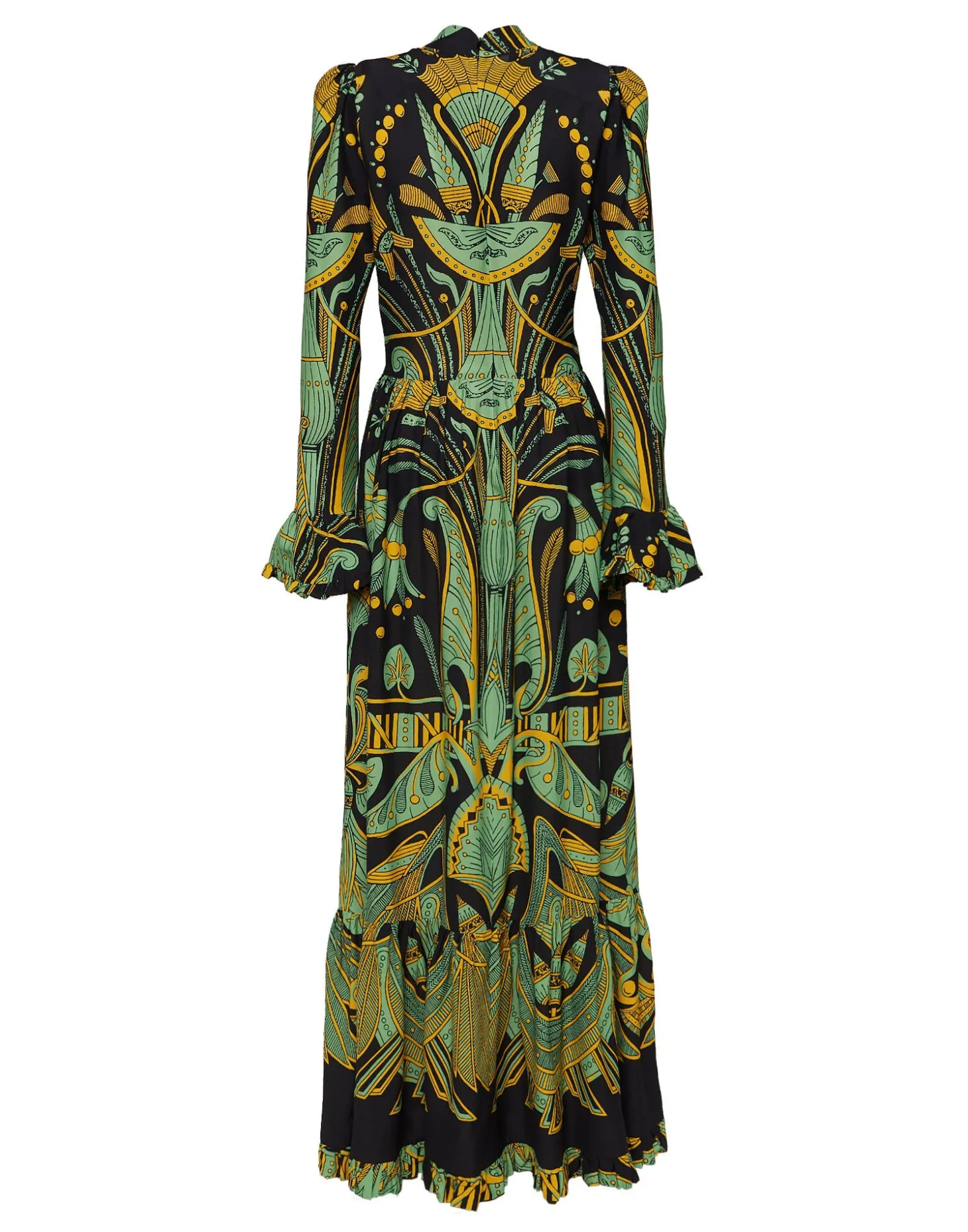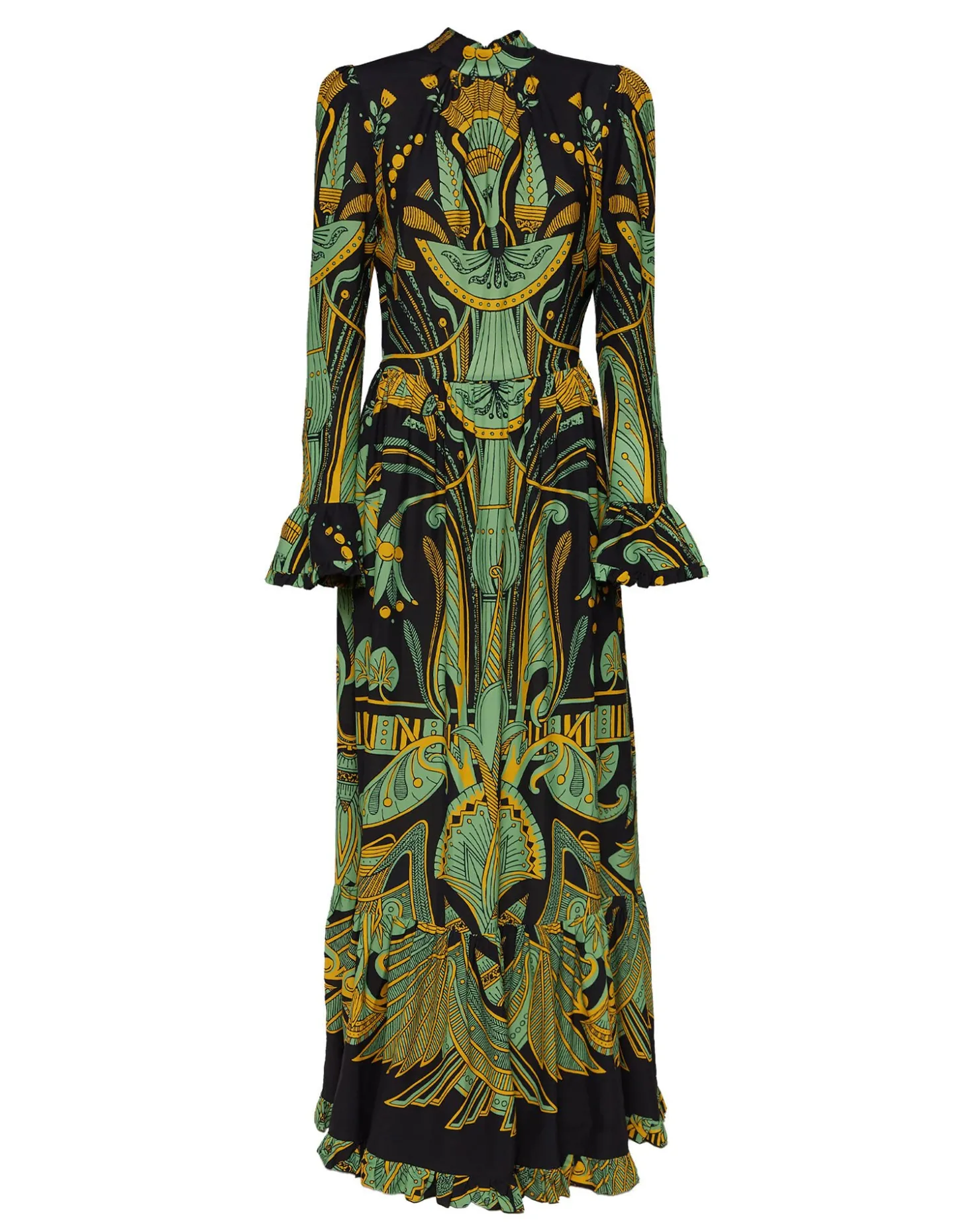 An evening dress inspired by Italy’s chicest family – palazzo not required. Made in our easy sablé with a hint of stretch, this dress is elegant, feminine and endlessly romantic. Floor length with a single ruched tier in the skirt, it has a mock neck with ruching around the décolleté, slightly gathered shoulders and sleeves that end in frilled bells. One for you enchantresses out there in this mystical vintage Nile print inspired by Ancient Egypt. Prepare to be beguiling!