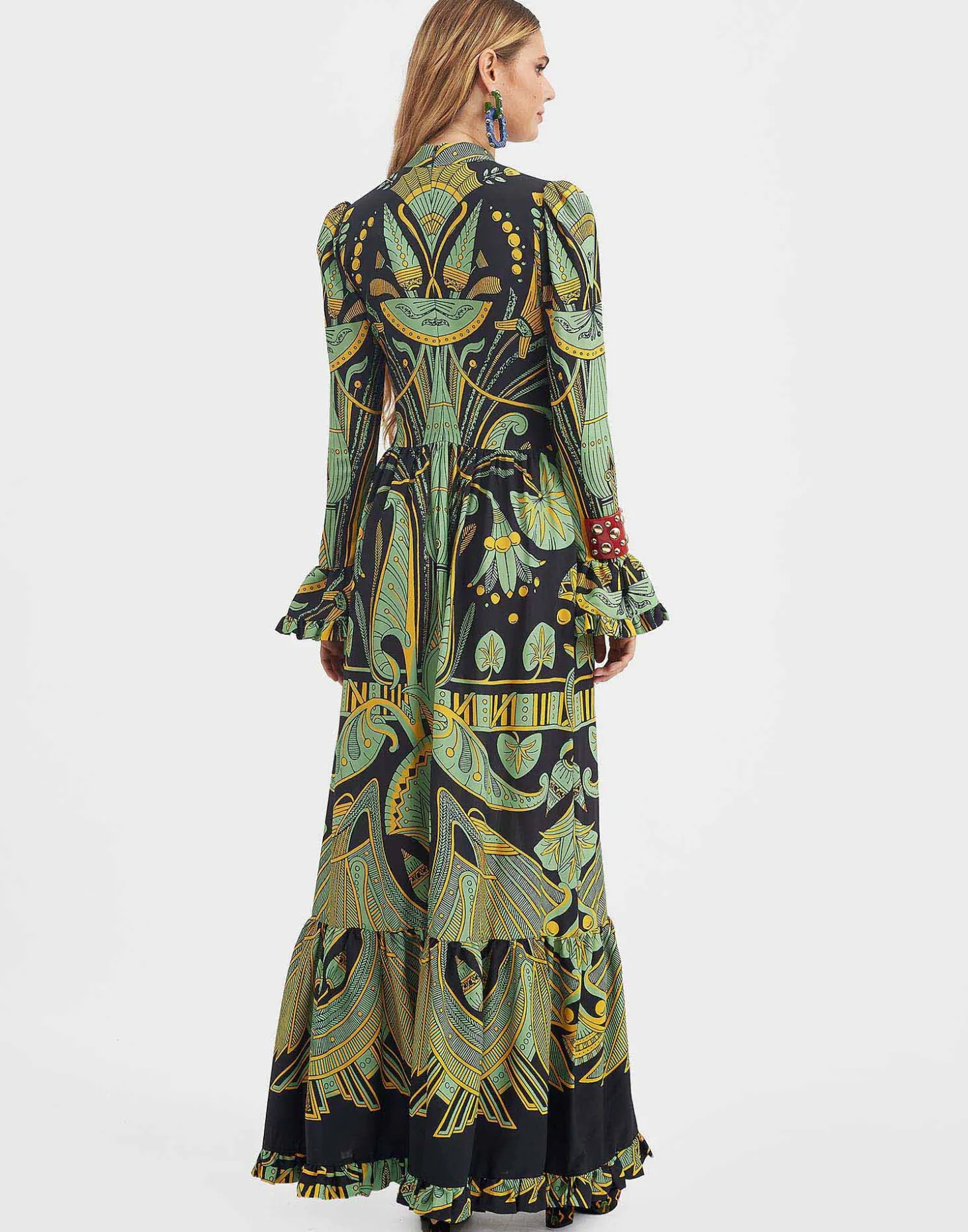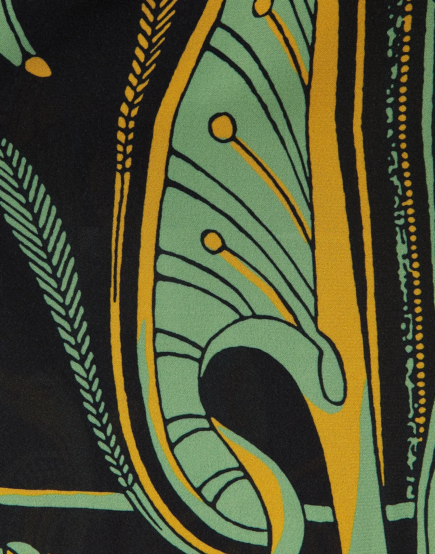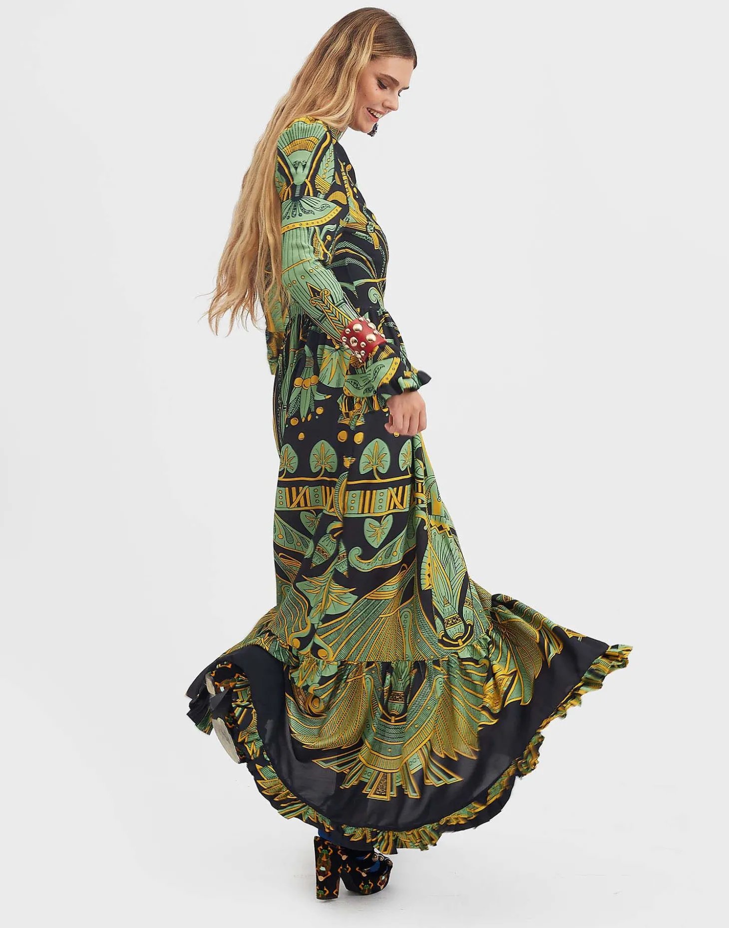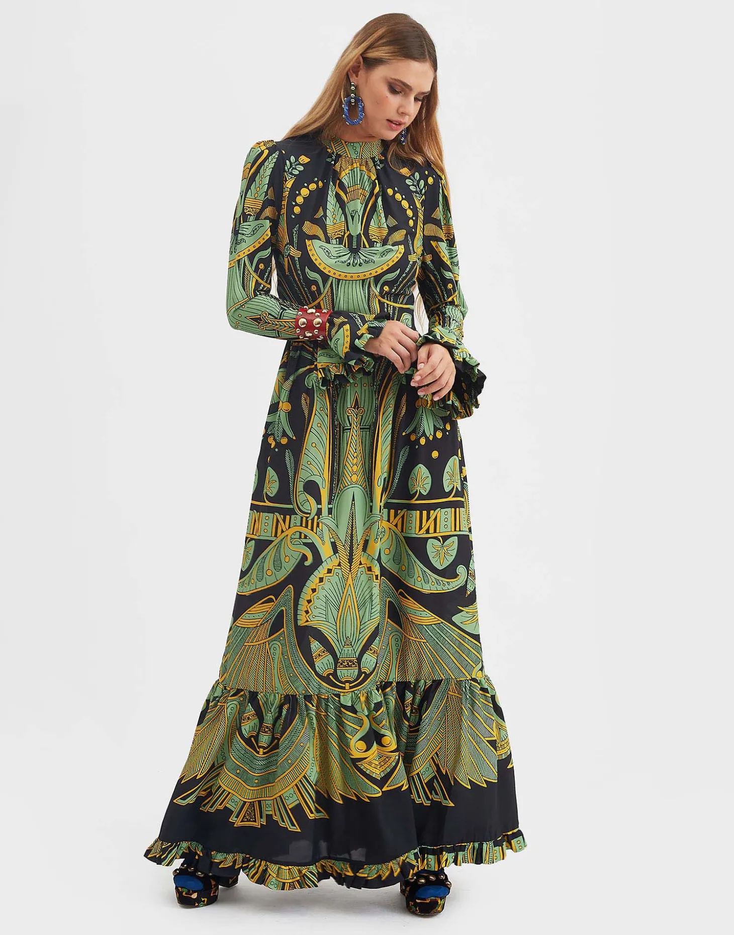 An evening dress inspired by Italy’s chicest family – palazzo not required. Made in our easy sablé with a hint of stretch, this dress is elegant, feminine and endlessly romantic. Floor length with a single ruched tier in the skirt, it has a mock neck with ruching around the décolleté, slightly gathered shoulders and sleeves that end in frilled bells. One for you enchantresses out there in this mystical vintage Nile print inspired by Ancient Egypt. Prepare to be beguiling!